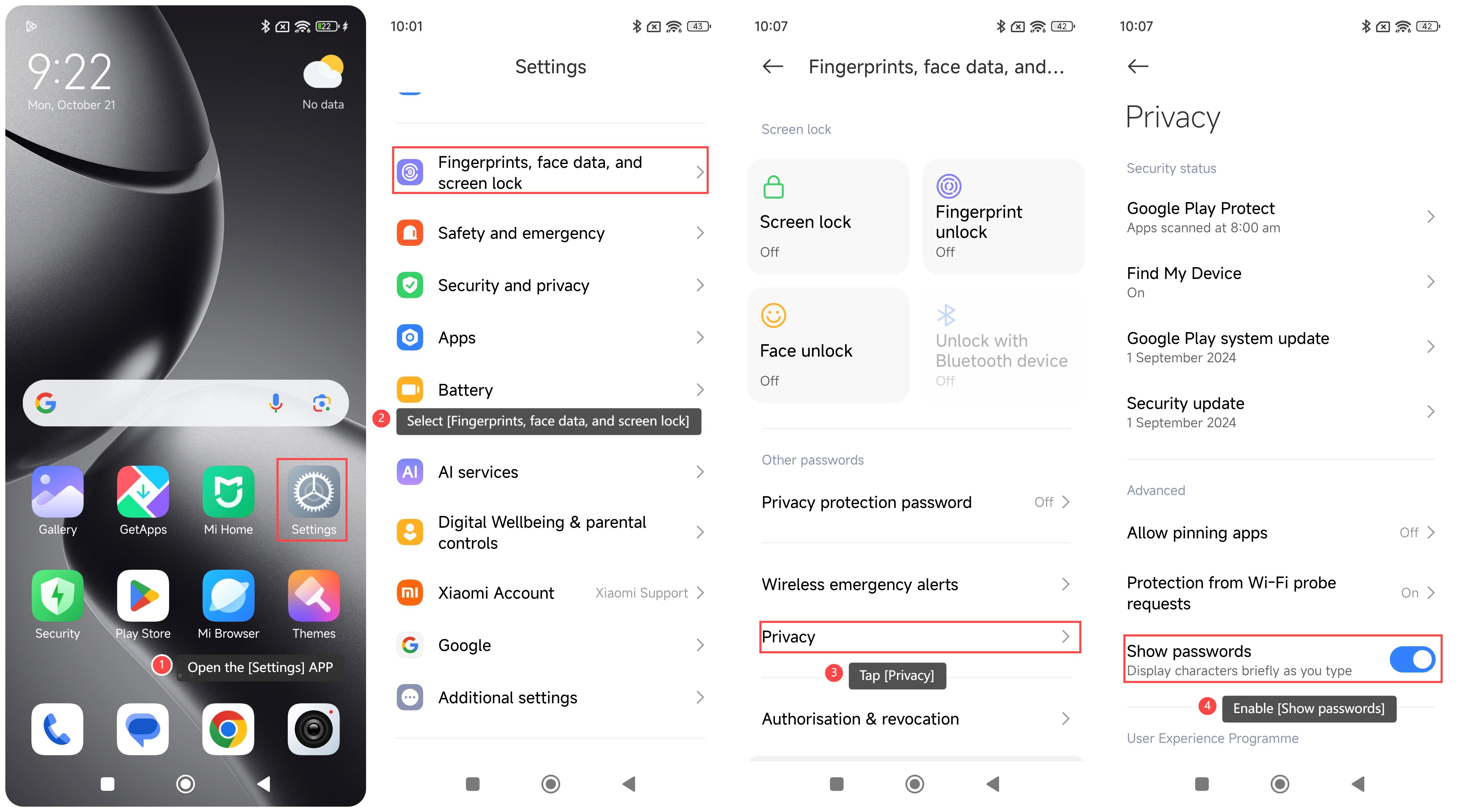 Nếu bạn đặt để hiển thị mật khẩu ngắn gọn trong khi nhập trên Xiaomi 14T Pro, điện thoại cho phép bạn xem các ký tự mật khẩu khi bạn nhập chúng. Khi được bật, các ký tự sẽ xuất hiện ngắn gọn trong văn bản thuần túy trước khi chuyển trở lại dấu hoa thị hoặc dấu chấm để bảo mật. Điều này có thể giúp đảm bảo bạn đang nhập đúng mật khẩu mà không cần chuyển đổi giữa các ký tự hiển thị và ẩn.