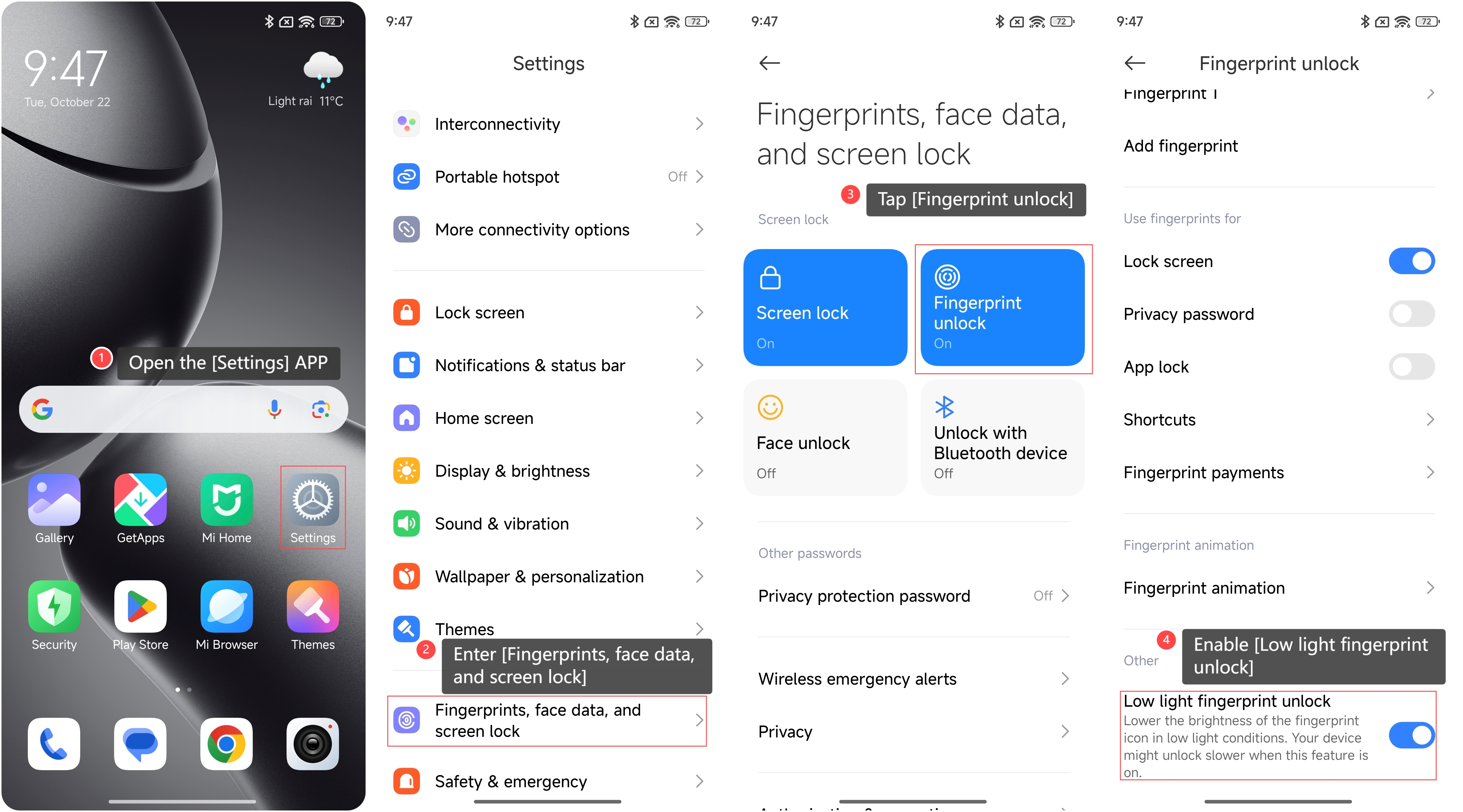 4. Bật [Mở khóa vân tay thiếu sáng].