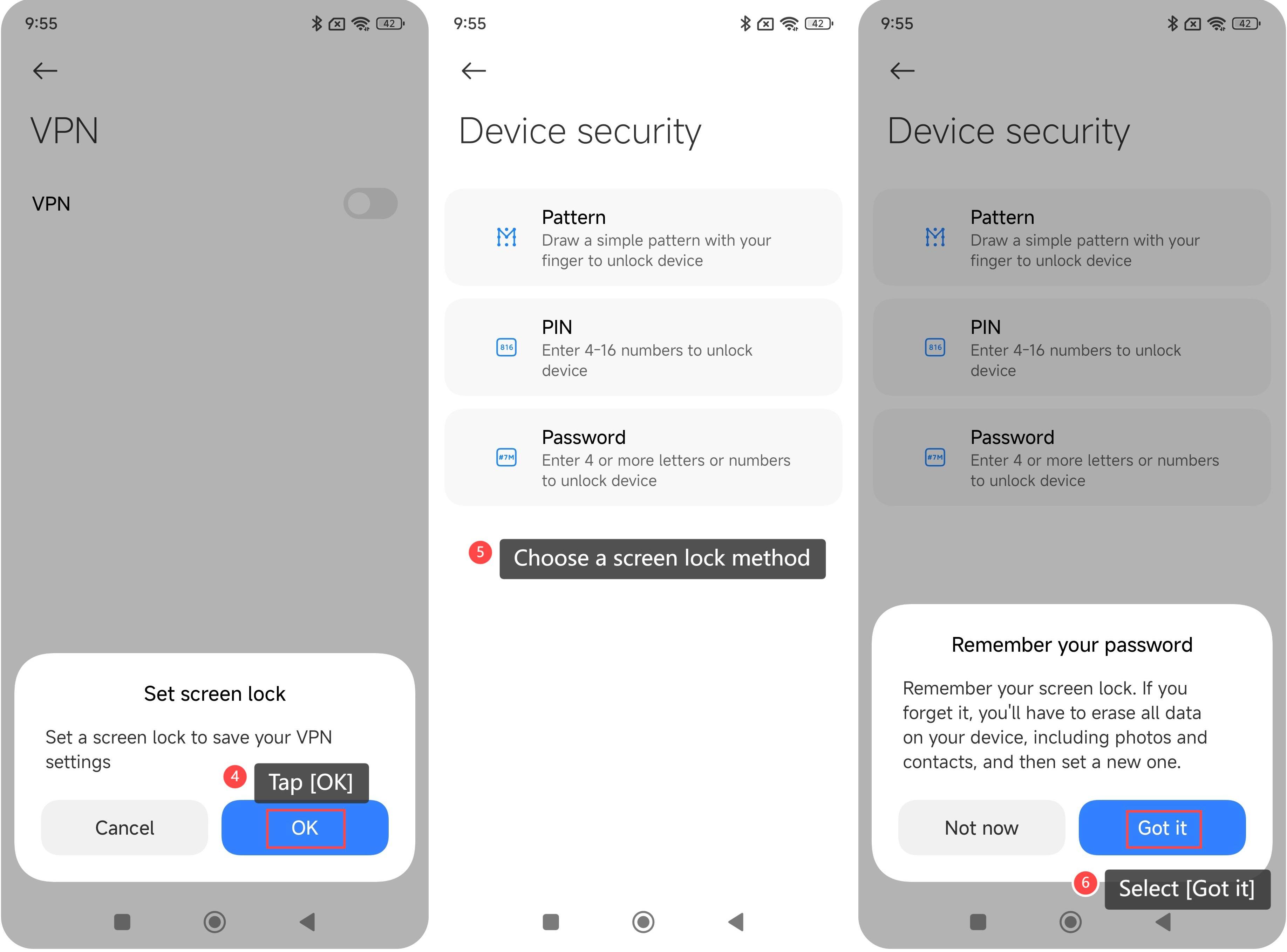 5. Chọn phương pháp khóa màn hình và đặt mật khẩu của bạn bằng cách làm theo lời nhắc trên màn hình;