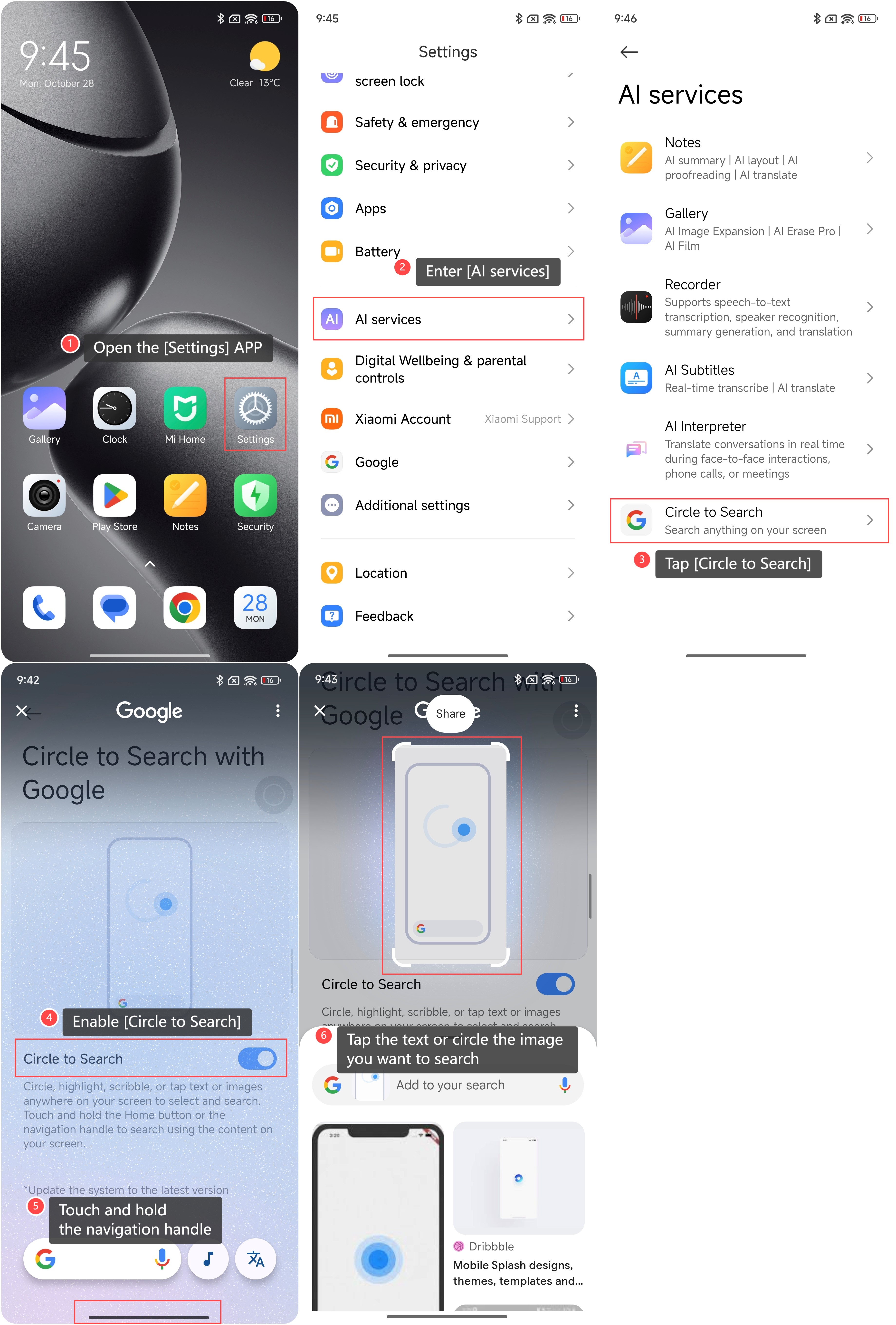 Xiaomi 14T Pro hỗ trợ chức năng Circle to Search. Khoanh tròn, tô sáng, viết nguệch ngoạc hoặc nhấn vào văn bản hoặc hình ảnh ở bất kỳ đâu trên màn hình của bạn để chọn và tìm kiếm. Bạn có thể chạm và giữ biểu tượng Màn hình chính hoặc núm điều khiển điều hướng để tìm kiếm bằng nội dung trên màn hình.