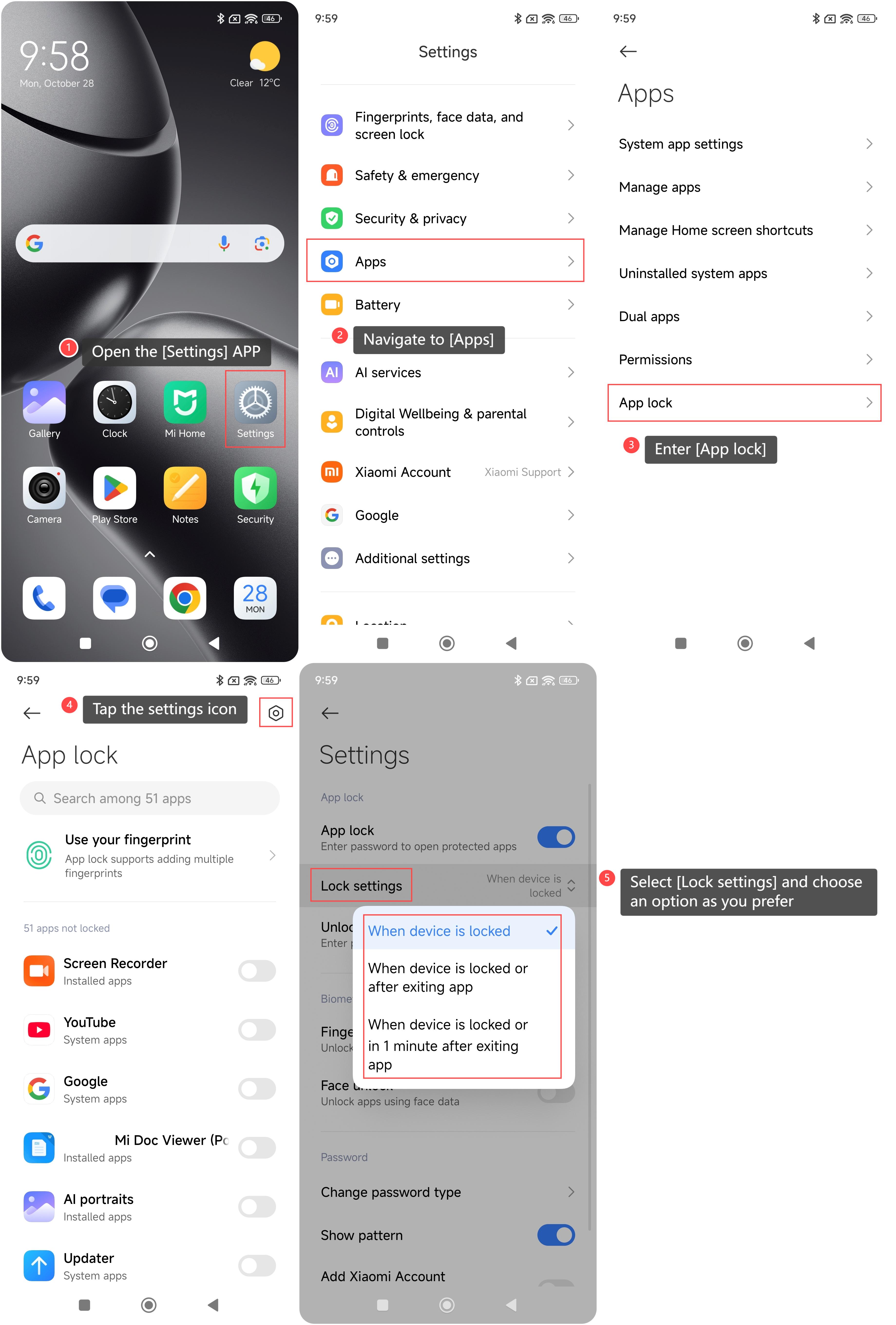 Để đặt cài đặt Khóa cho App lock trên điện thoại, vui lòng tham khảo các bước sau: