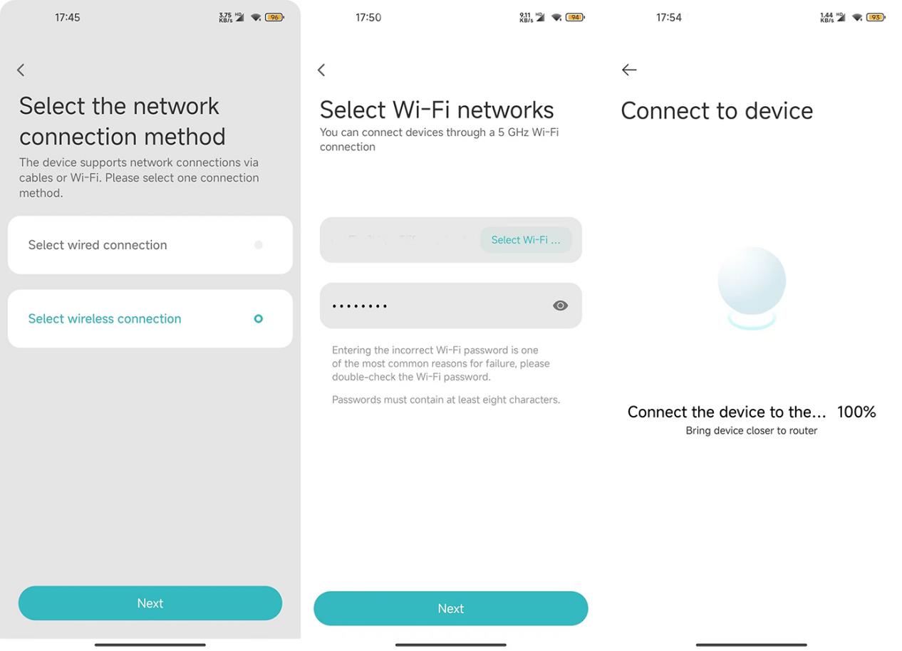 5. Nhấn vào [Đặt lại thiết bị] >> điện thoại của bạn bắt đầu quét máy ảnh >> chọn bộ định tuyến 2.4GHz hoặc 5GHz và nhập mật khẩu Wi-Fi >> nhấn vào [Tiếp theo] >> thêm thiết bị (giữ điện thoại càng gần thiết bị càng tốt trong quá trình này). Sau vài giây, máy ảnh sẽ nhắc bạn bằng giọng nói rằng Wi-Fi đã được kết nối thành công;