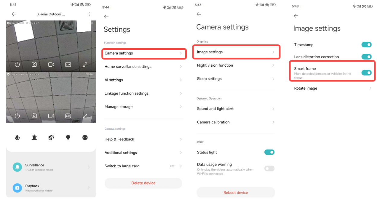4. Đi tới [Cài đặt máy ảnh] >> [Cài đặt hình ảnh] >> bật [Khung thông minh] để đánh dấu hình dạng người hoặc phương tiện được phát hiện trong video;