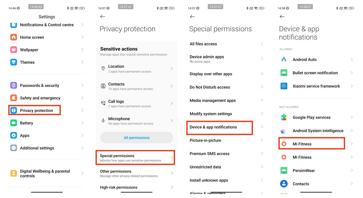 1. Để sử dụng dây đeo tốt hơn, bạn nên giữ cho ứng dụng Mi Fitness chạy ở chế độ nền. Để tránh dọn dẹp bộ nhớ trong hệ thống Android và một số quy trình dọn dẹp hoặc chặn phần mềm bảo mật, vui lòng đặt nó theo các yêu cầu trong ứng dụng Mi Fitness >> [Thiết bị] >> [Thông báo và cuộc gọi] >> [Quyền truy cập B];