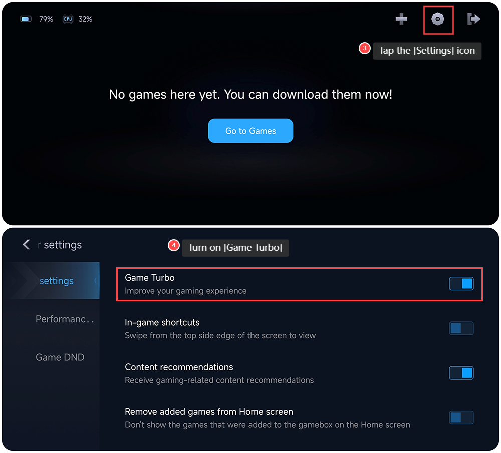 2. Cuộn xuống và nhấn vào [Game Turbo];