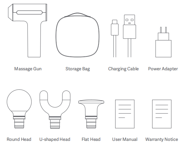 Có Xiaomi Massage Gun 2, túi đựng đồ, cáp sạc, bộ đổi nguồn, đầu tròn, đầu hình chữ U, đầu phẳng, hướng dẫn sử dụng và Thông báo bảo hành.