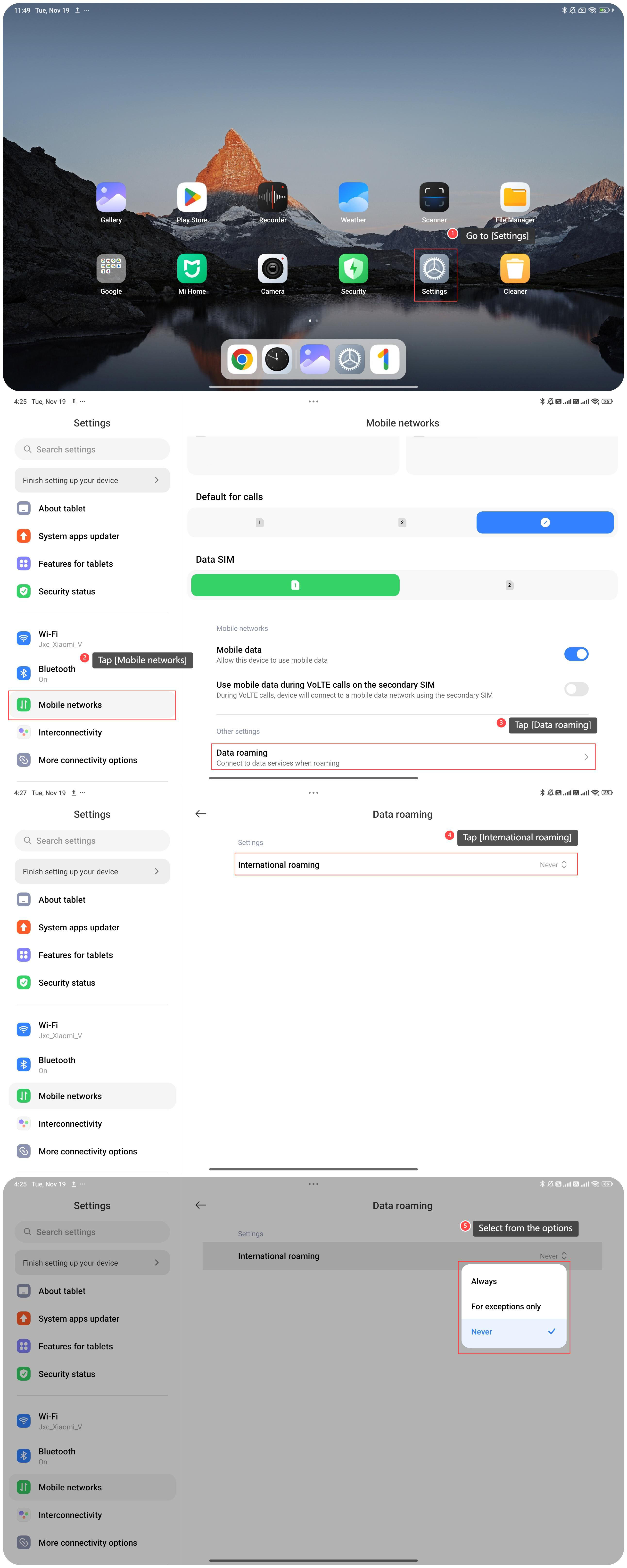 Chuyển vùng dữ liệu trên Redmi Pad Pro 5G cho phép bạn sử dụng các dịch vụ dữ liệu di động khi bạn ở bên ngoài vùng phủ sóng của nhà cung cấp dịch vụ gia đình, chẳng hạn như khi đi du lịch quốc tế. Tính năng này cho phép bạn truy cập internet, gửi tin nhắn và thực hiện cuộc gọi bằng mạng nước ngoài. Tuy nhiên, nó thường đi kèm với các khoản phí bổ sung, vì vậy điều cần thiết là phải kiểm tra các chính sách chuyển vùng của nhà cung cấp dịch vụ của bạn.