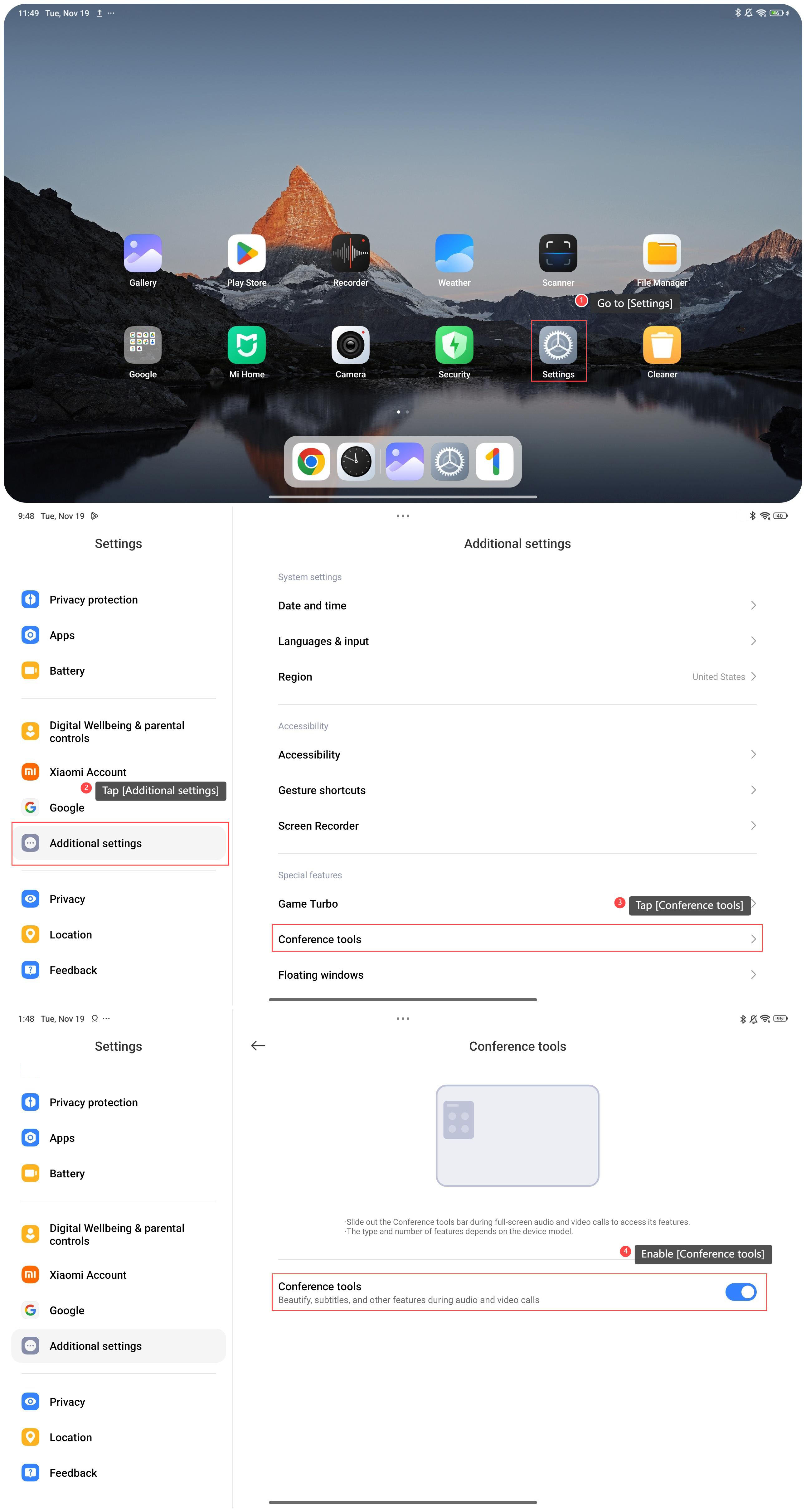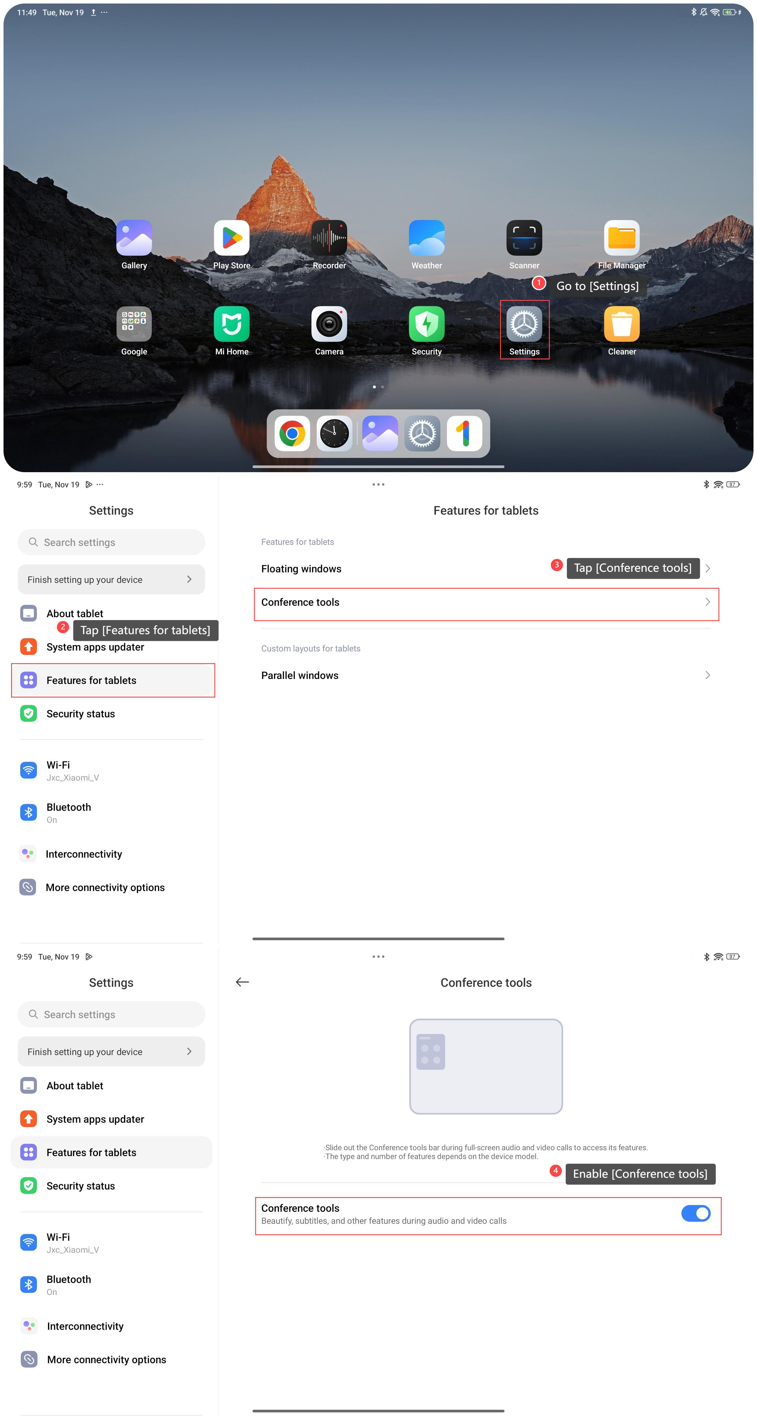 Để bật thanh công cụ hội nghị trên máy tính bảng của bạn, vui lòng tham khảo các phương pháp sau:
