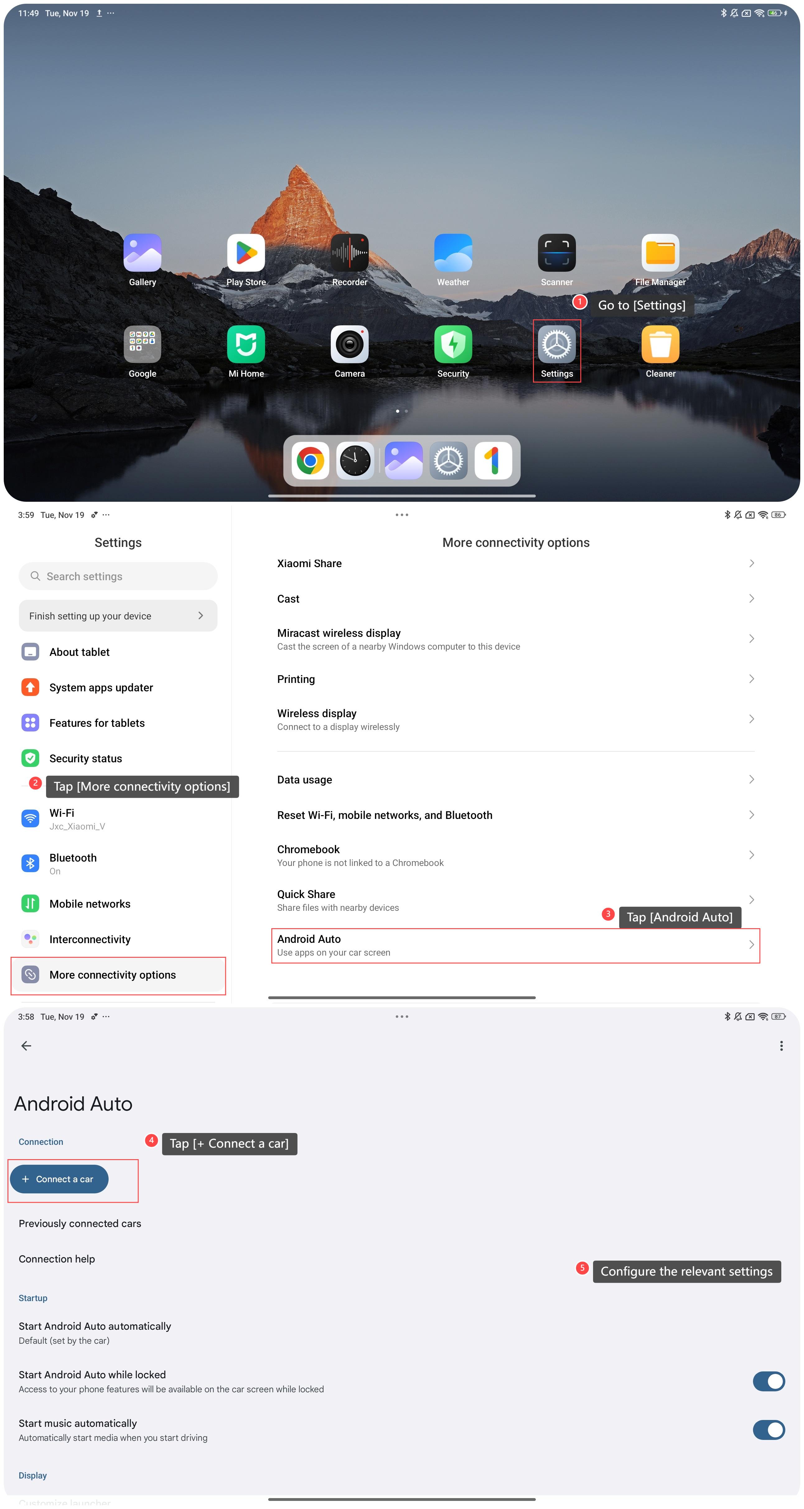 Để sử dụng Android auto trên máy tính bảng, vui lòng tham khảo các bước sau:
