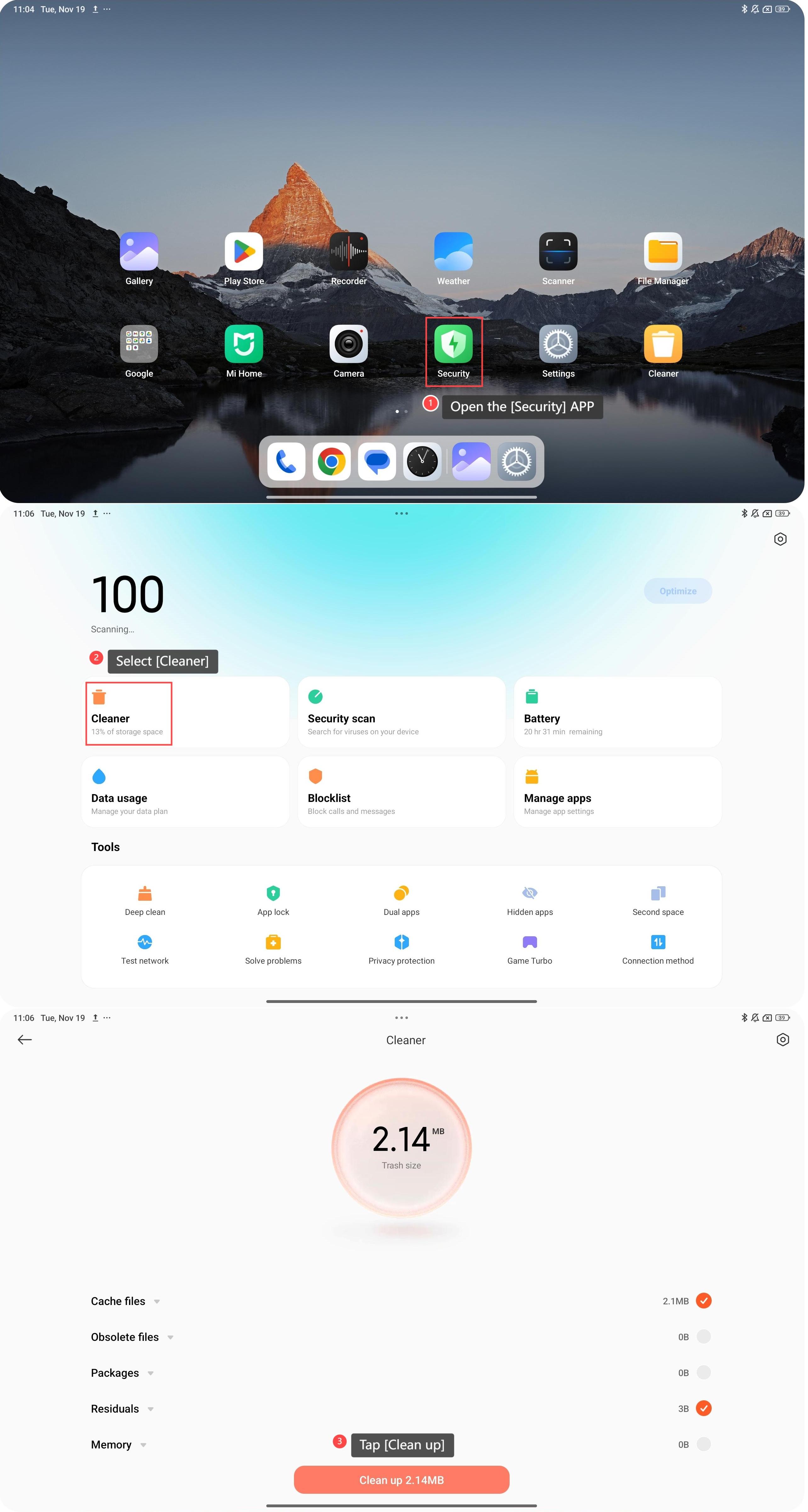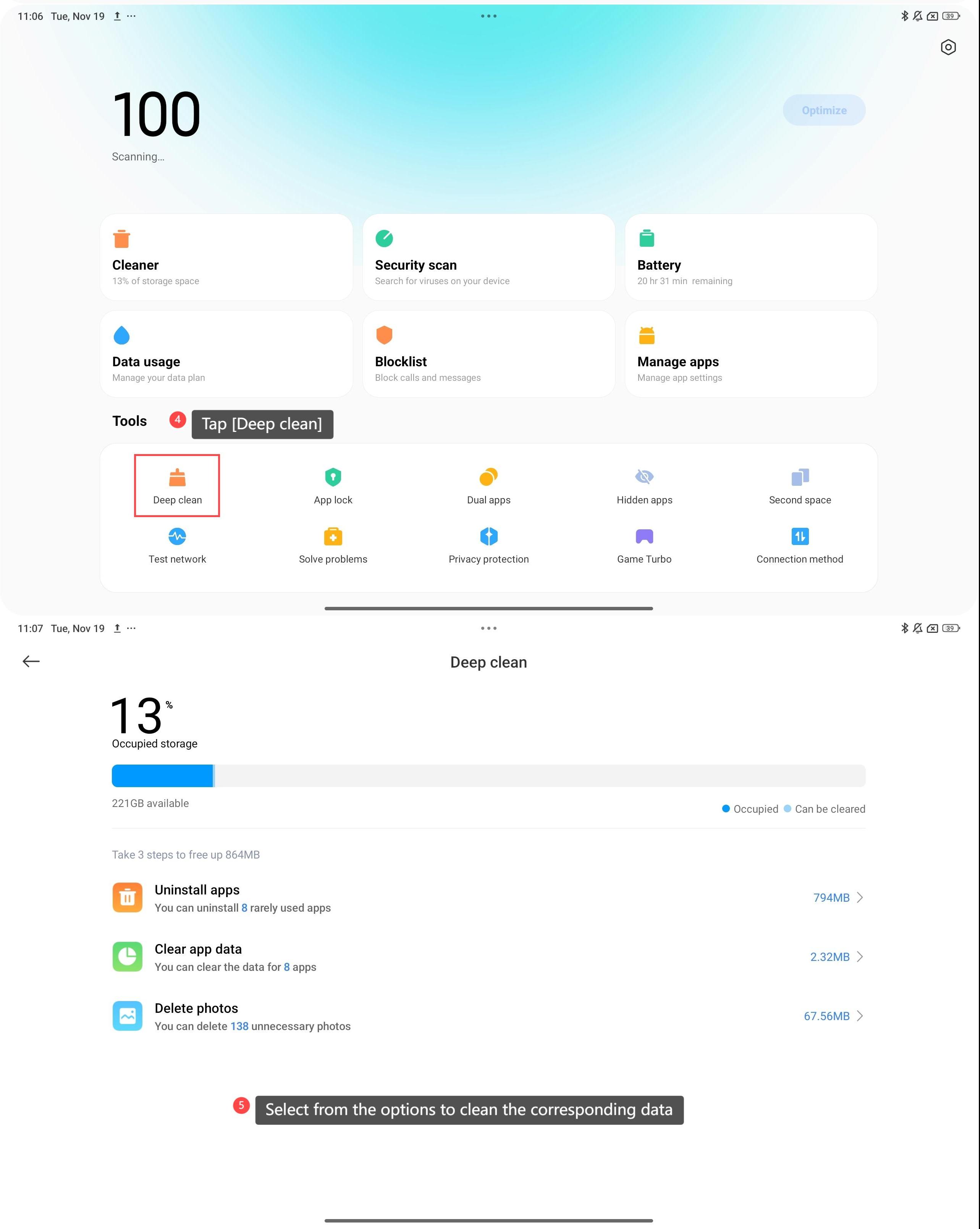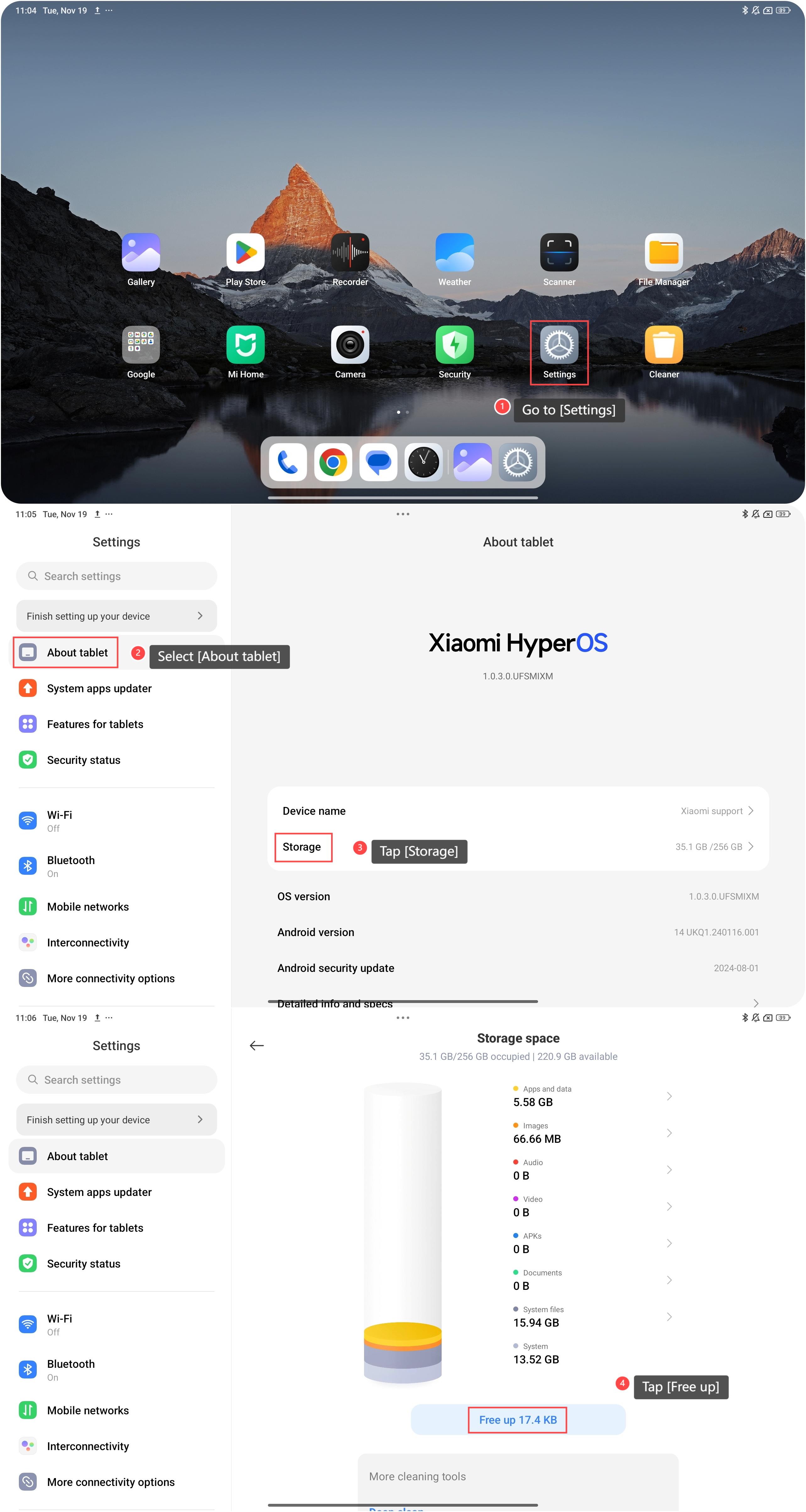 Redmi Pad Pro 5G hỗ trợ giải phóng dung lượng lưu trữ, có thể lưu các tài liệu, ảnh và ứng dụng cần thiết mà không lo hết dung lượng. Có đủ dung lượng lưu trữ cũng giúp bạn dễ dàng tạo bản sao lưu các tệp và ứng dụng của mình, bảo vệ khỏi mất dữ liệu. Để giải phóng dung lượng lưu trữ của máy tính bảng, vui lòng tham khảo các phương pháp sau: Phương pháp 1: 1. Đi tới [Cài đặt]; 2. Chọn [Giới thiệu về máy tính bảng]; 3. Nhấn vào [Lưu trữ]; 4. Cuộn xuống và nhấn vào [Giải phóng]. Phương pháp 2: 1. Mở ứng dụng [Bảo mật]; 2. Chọn [Cleaner]; 3. Nhấn vào [Dọn dẹp]; 4. Bạn cũng có thể nhấn vào [Làm sạch sâu]; 5. Chọn từ các tùy chọn để làm sạch dữ liệu tương ứng. Ghi: Vui lòng không xóa sai dữ liệu hữu ích khi bạn giải phóng dung lượng lưu trữ từ tùy chọn làm sạch sâu.