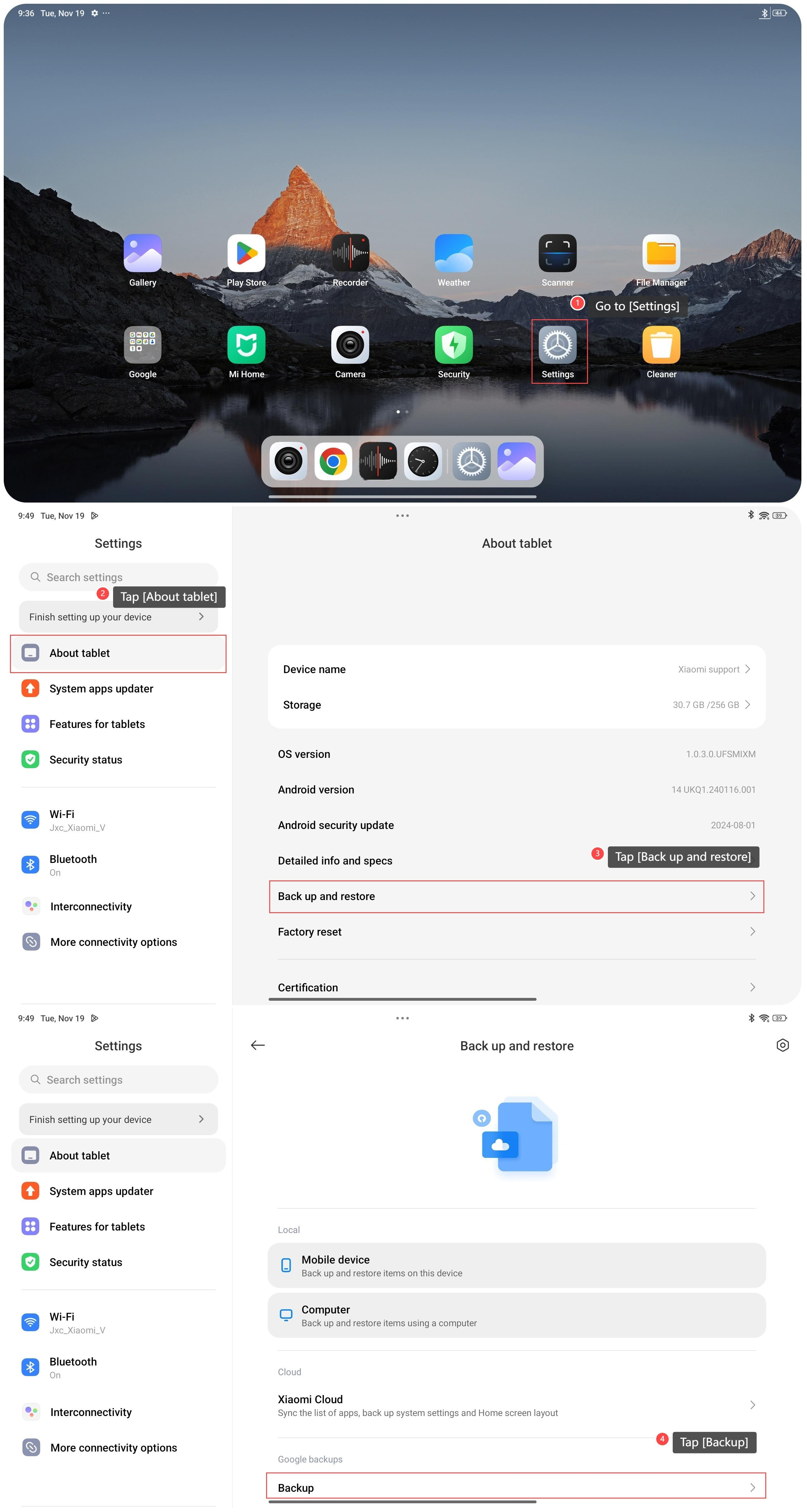 Chức năng sao lưu dữ liệu trên Redmi Pad Pro cho phép bạn tạo các bản sao của dữ liệu quan trọng, chẳng hạn như ảnh, video, tài liệu và cài đặt APP, để tránh bị mất. Tính năng này cho phép bạn lưu trữ các bản sao lưu trên các dịch vụ đám mây hoặc cục bộ trên các thiết bị lưu trữ bên ngoài. Thường xuyên sao lưu dữ liệu của bạn đảm bảo rằng bạn có thể dễ dàng khôi phục dữ liệu trong trường hợp thiết bị bị mất, hư hỏng hoặc lỗi hệ thống. Bạn có thể quản lý cài đặt sao lưu thông qua menu cài đặt của thiết bị, cho phép bạn lên lịch sao lưu tự động hoặc thực hiện sao lưu thủ công một cách thuận tiện. Để sao lưu dữ liệu của máy tính bảng, vui lòng tham khảo các phương pháp sau: Phương pháp 1: 1. Đi tới [Cài đặt]; 2. Nhấn [Giới thiệu về máy tính bảng]; 3. Nhấn vào [Sao lưu và khôi phục]; 4. Nhấn vào [Thiết bị di động] hoặc [Máy tính] và làm theo hướng dẫn để thực hiện sao lưu cục bộ. Phương pháp 2: 1. Đi tới [Cài đặt]; 2. Nhấn [Giới thiệu về máy tính bảng]; 3. Nhấn vào [Sao lưu và khôi phục]; 4. Nhấn vào [Xiaomi Cloud]; 5. Bật [Đồng bộ hóa]; 6. Nhấn vào [Tiếp tục]; 7. Chọn từ các ứng dụng để đồng bộ hóa dữ liệu APP; 8. Nhấn vào [Sao lưu]; 9. Bật [Sao lưu tự động] và thiết bị sẽ tự động sao lưu khi đáp ứng các điều kiện; 10. Bạn cũng có thể nhấn vào [Lịch sao lưu] và thiết lập chu kỳ sao lưu tự động; 11. Nhấn vào [Sao lưu ngay]. Phương pháp 3: 1. Đi tới [Cài đặt]; 2. Nhấn [Giới thiệu về máy tính bảng]; 3. Nhấn vào [Sao lưu và khôi phục]; 4. Nhấn vào [Sao lưu]; 5. Chọn từ các tùy chọn bạn muốn sao lưu; 6. Nhấn vào [Xác nhận]; 7. Bạn có thể nhấn vào [Quản lý sao lưu] để định cấu hình các cài đặt sao lưu có liên quan.