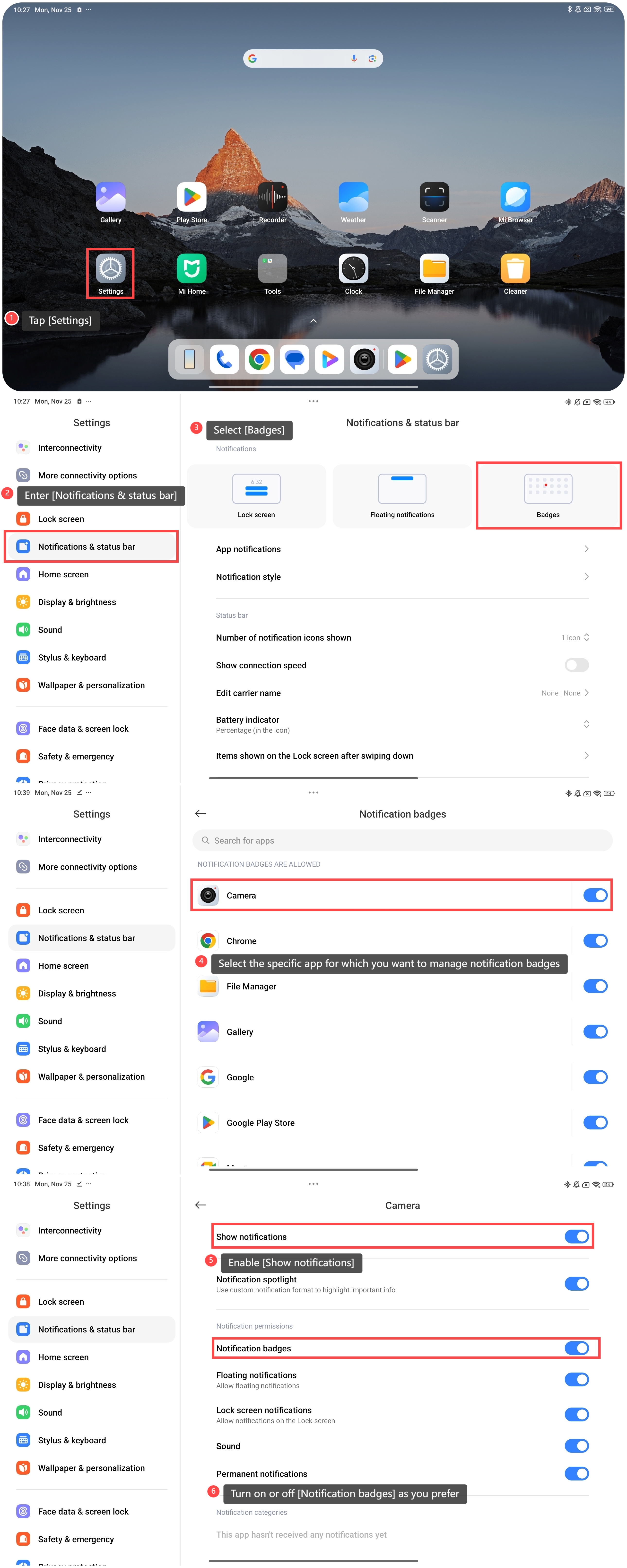 Bằng cách quản lý huy hiệu thông báo trên Redmi Pad Pro 5G một cách thông minh, bạn có thể thấy ngay các ứng dụng có thông báo mới mà không cần mở chúng. Nó cải thiện hiệu quả sử dụng máy tính bảng, giảm nhiễu và cải thiện khả năng lấy nét để có trải nghiệm sử dụng hợp lý hơn. Để quản lý huy hiệu thông báo trên máy tính bảng, vui lòng tham khảo các phương pháp sau: Phương pháp 1: 1. Nhấn vào [Cài đặt]; 2. Vào [Thông báo & thanh trạng thái]; 3. Chọn [Huy hiệu]; 4. Chọn ứng dụng cụ thể mà bạn muốn quản lý huy hiệu thông báo; 5. Bật [Hiển thị thông báo]; 6. Bật hoặc tắt [Huy hiệu thông báo] tùy thích.