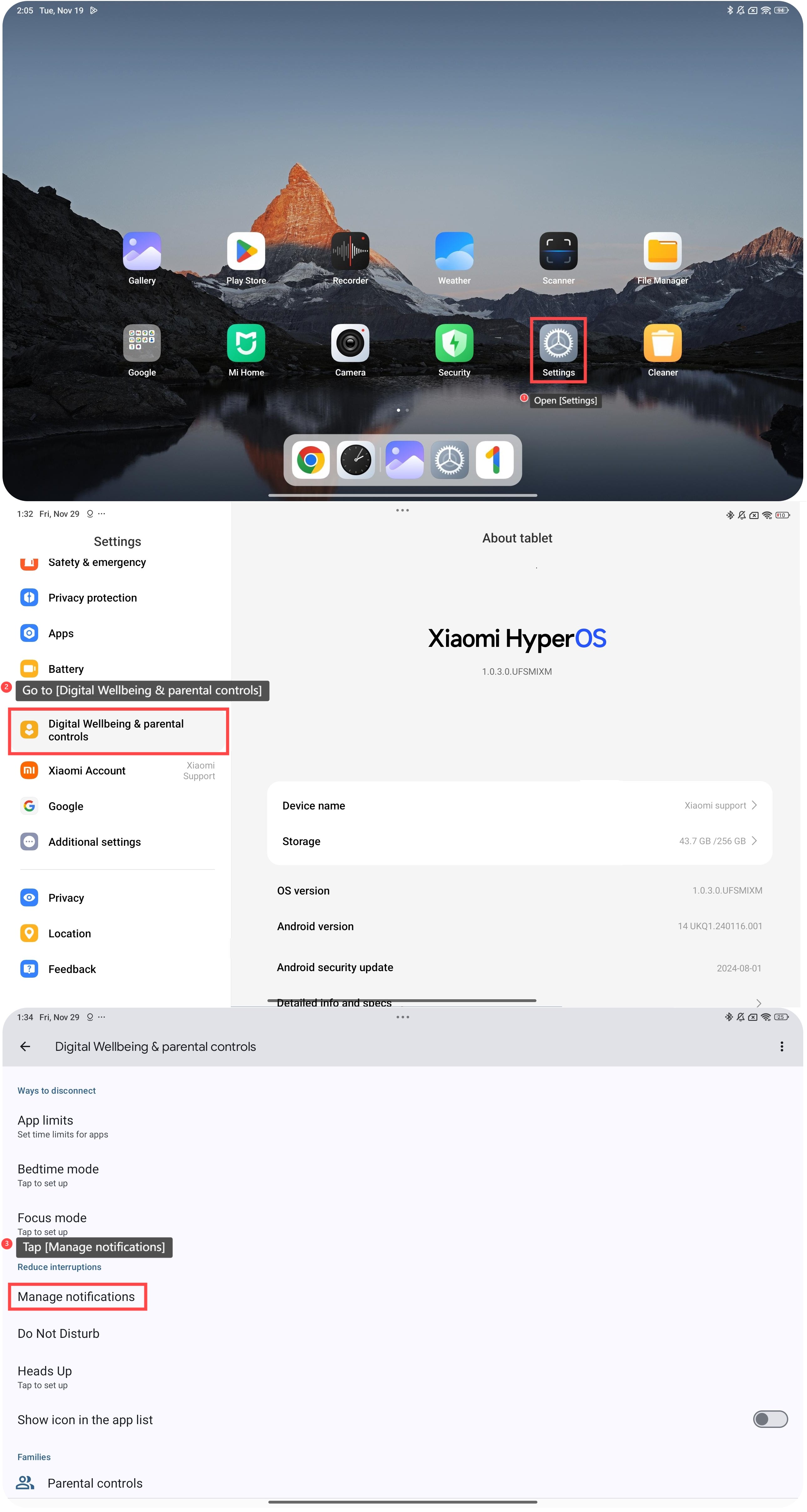Phương pháp 2: 1. Mở [Cài đặt]; 2. Đi tới [Sức khỏe kỹ thuật số & kiểm soát của phụ huynh]; 3. Nhấn vào [Quản lý thông báo];