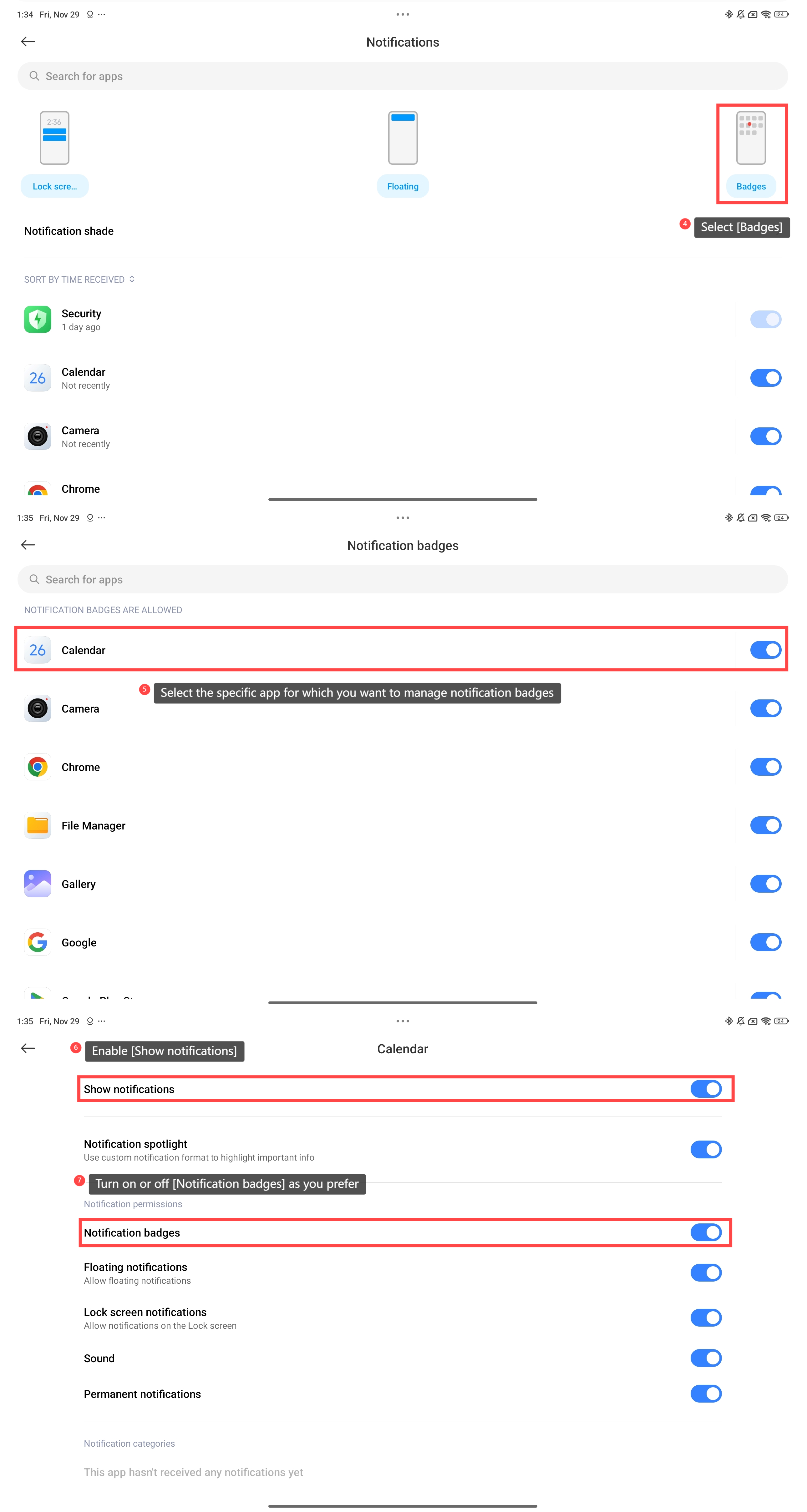 4. Chọn [Huy hiệu]; 5. Chọn ứng dụng cụ thể mà bạn muốn quản lý huy hiệu thông báo; 6. Bật [Hiển thị thông báo]; 7. Bật hoặc tắt [Huy hiệu thông báo] tùy thích.