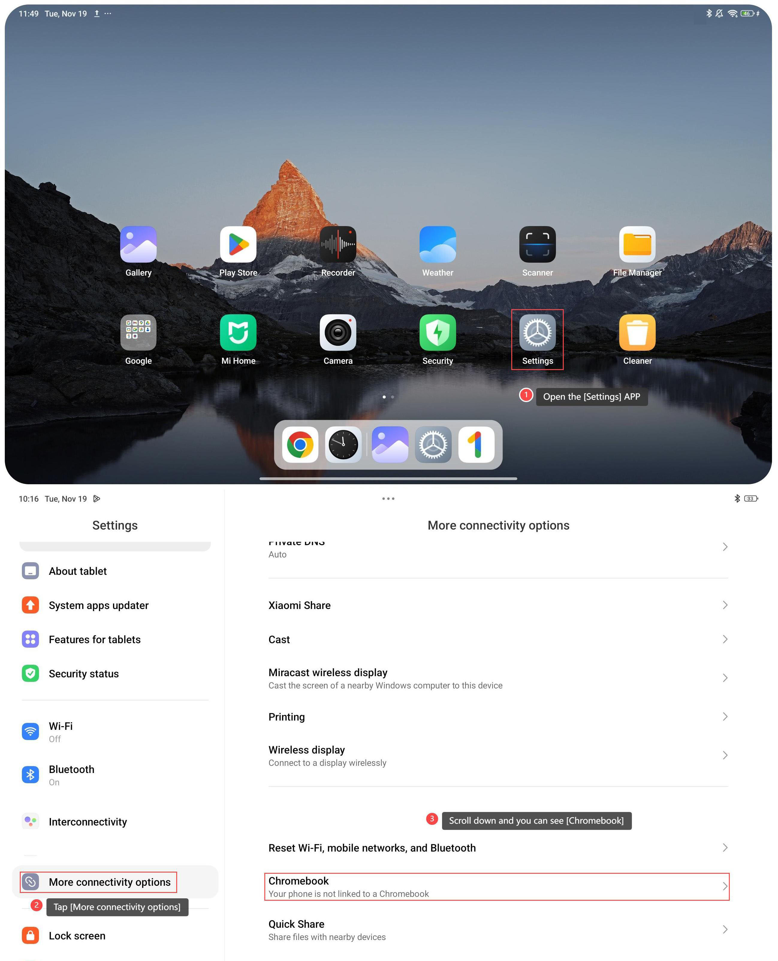Để liên kết máytính bảng của bạn với Chromebook, vui lòng tham khảo các bước sau: