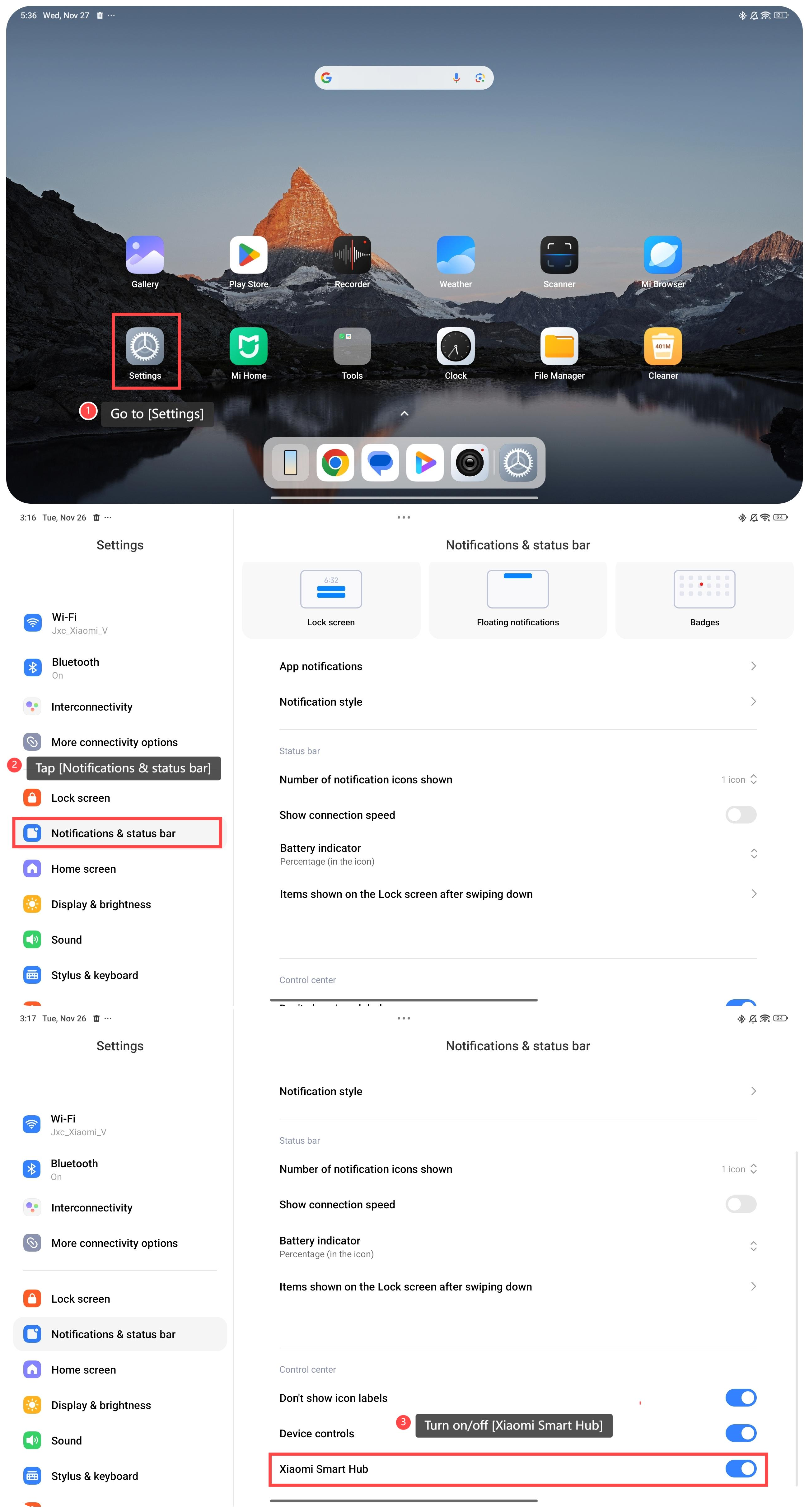 bật / tắt Xiaomi Smart Hub trên trung tâm điều khiển, vui lòng tham khảo các bước sau: