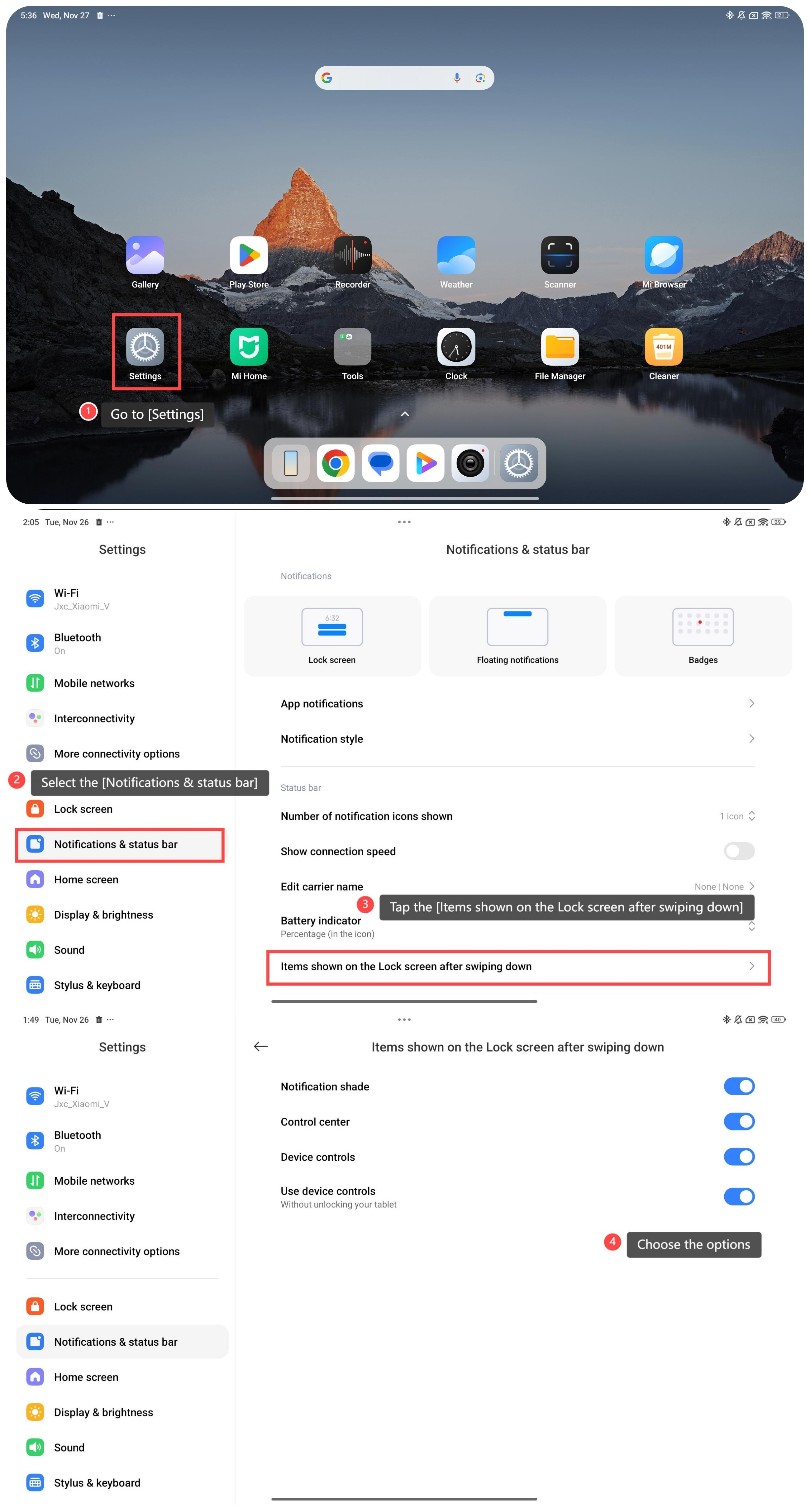 Để đặt các mục hiển thị trên Màn hình khóa sau khi vuốt xuống, vui lòng tham khảo các bước sau: