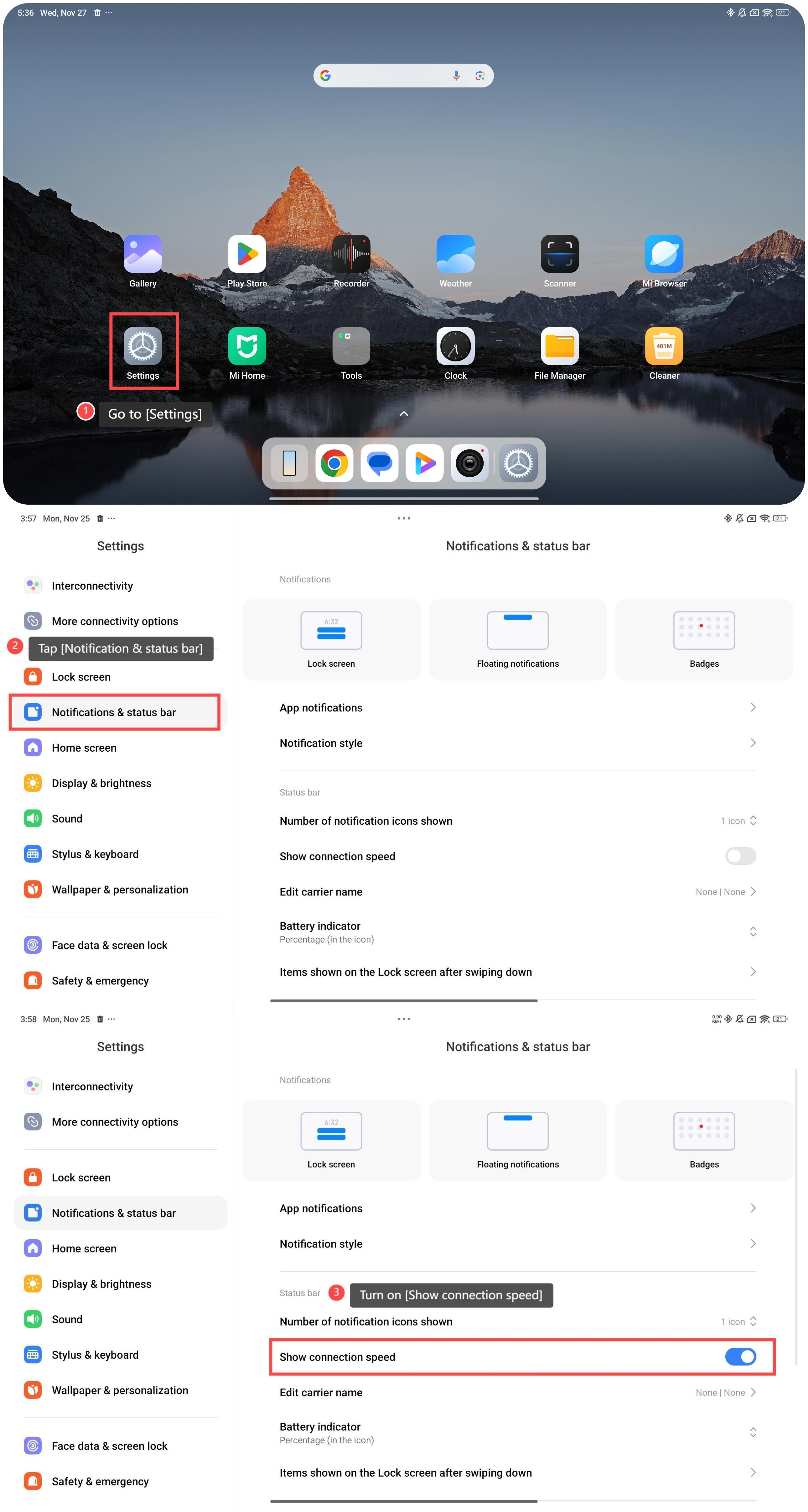 Để hiển thị tốc độ kết nối trên máy tính bảng của bạn, vui lòng tham khảo các bước sau: