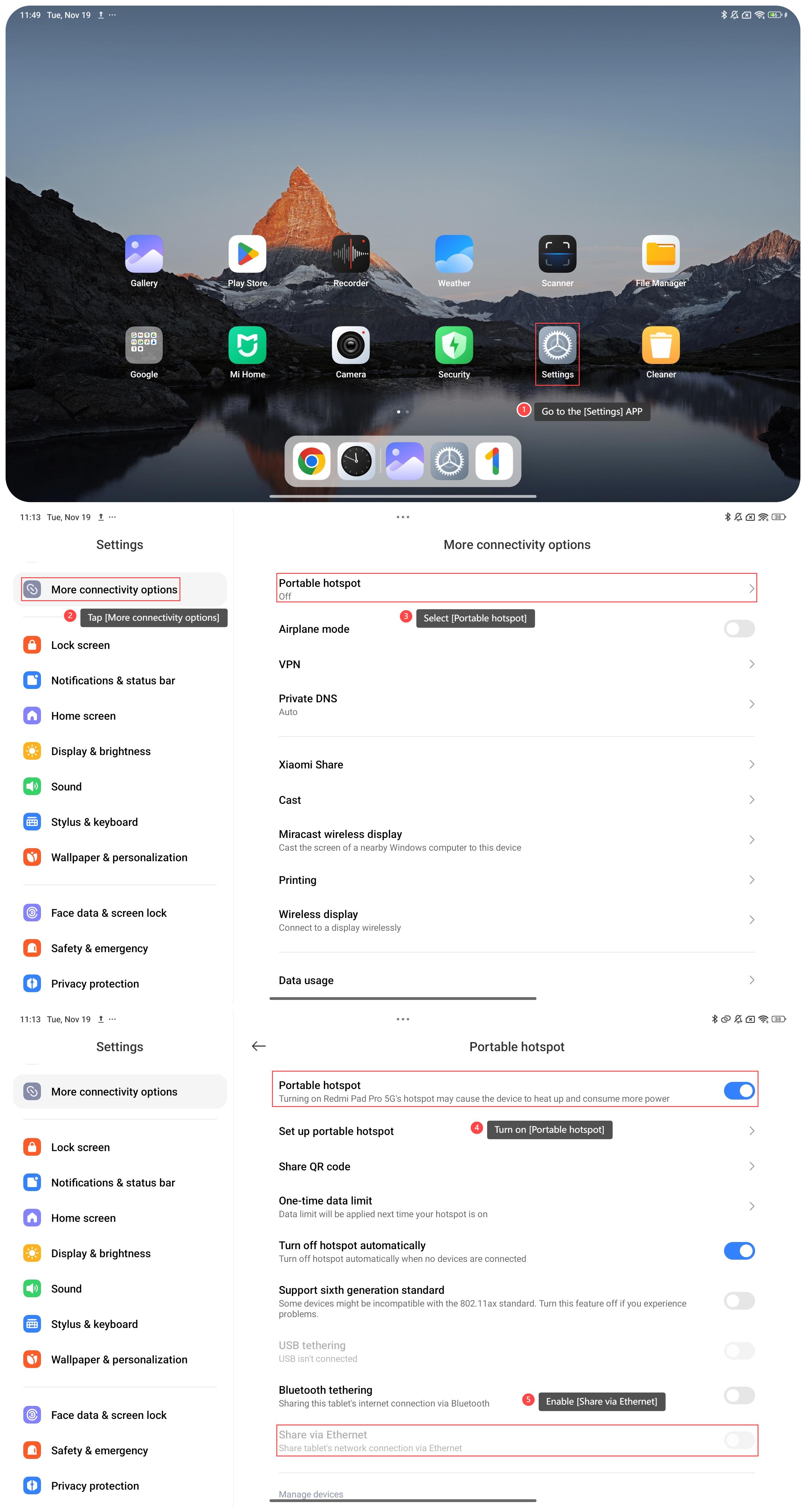 Để chia sẻ điểm phát sóng của máy tính bảng của bạn qua Ethernet, vui lòng tham khảo các bước sau: