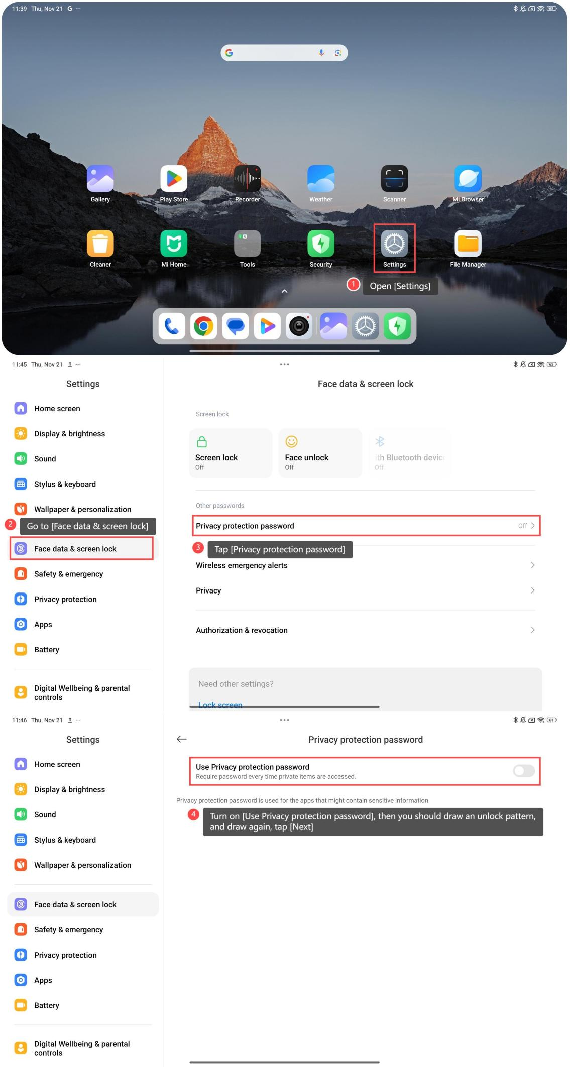 Các ảnh riêng tư trên Redmi Pad Pro 5G ẩn ảnh cá nhân hoặc ảnh nhạy cảm khỏi thư viện chính và chỉ có thể truy cập chúng bằng mật khẩu được bảo vệ quyền riêng tư, đảm bảo người dùng trái phép không thể xem chúng. Để tạo ảnh riêng tư, vui lòng tham khảo các bước sau: 1. Mở [Cài đặt]; 2. Đi tới [Dữ liệu khuôn mặt & khóa màn hình]; 3. Nhấn vào [Mật khẩu bảo vệ quyền riêng tư]; 4. Bật [Sử dụng mật khẩu bảo vệ quyền riêng tư], sau đó bạn nên vẽ một mẫu mở khóa và vẽ lại, nhấn vào [Tiếp theo]; 5. Nhấn vào [Không phải bây giờ] hoặc [Thêm], nếu bạn thêm Tài khoản Xiaomi, bạn chỉ cần nhập mật khẩu cho Tài khoản Xiaomi bạn đã thêm để đặt lại mật khẩu; 6. Chọn [Ảnh]; 7. Nhấn vào [Sử dụng] và bạn đã tạo album riêng tư. Để kiểm tra ảnh riêng tư, vui lòng tham khảo các bước sau: 1. Mở [Thư viện]; 2. Đi tới [Album]; 3. Trượt màn hình xuống và vẽ mẫu mở khóa của bạn để vào album riêng tư; 4. Kiểm tra ảnh riêng tư của bạn tại đây. Lời khuyên thân thiện: Nếu bạn muốn đặt ảnh ở chế độ công khai trở lại, hãy chuyển đến album riêng tư, chọn ảnh và di chuyển chúng trở lại album tiêu chuẩn.