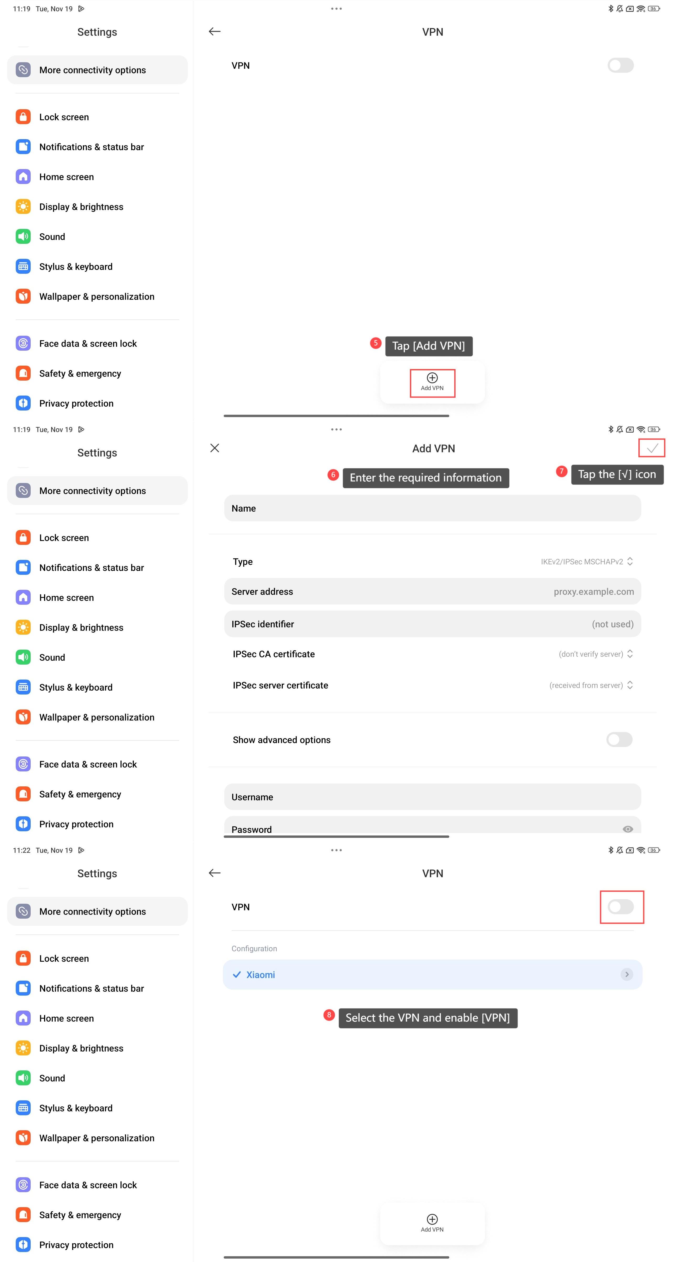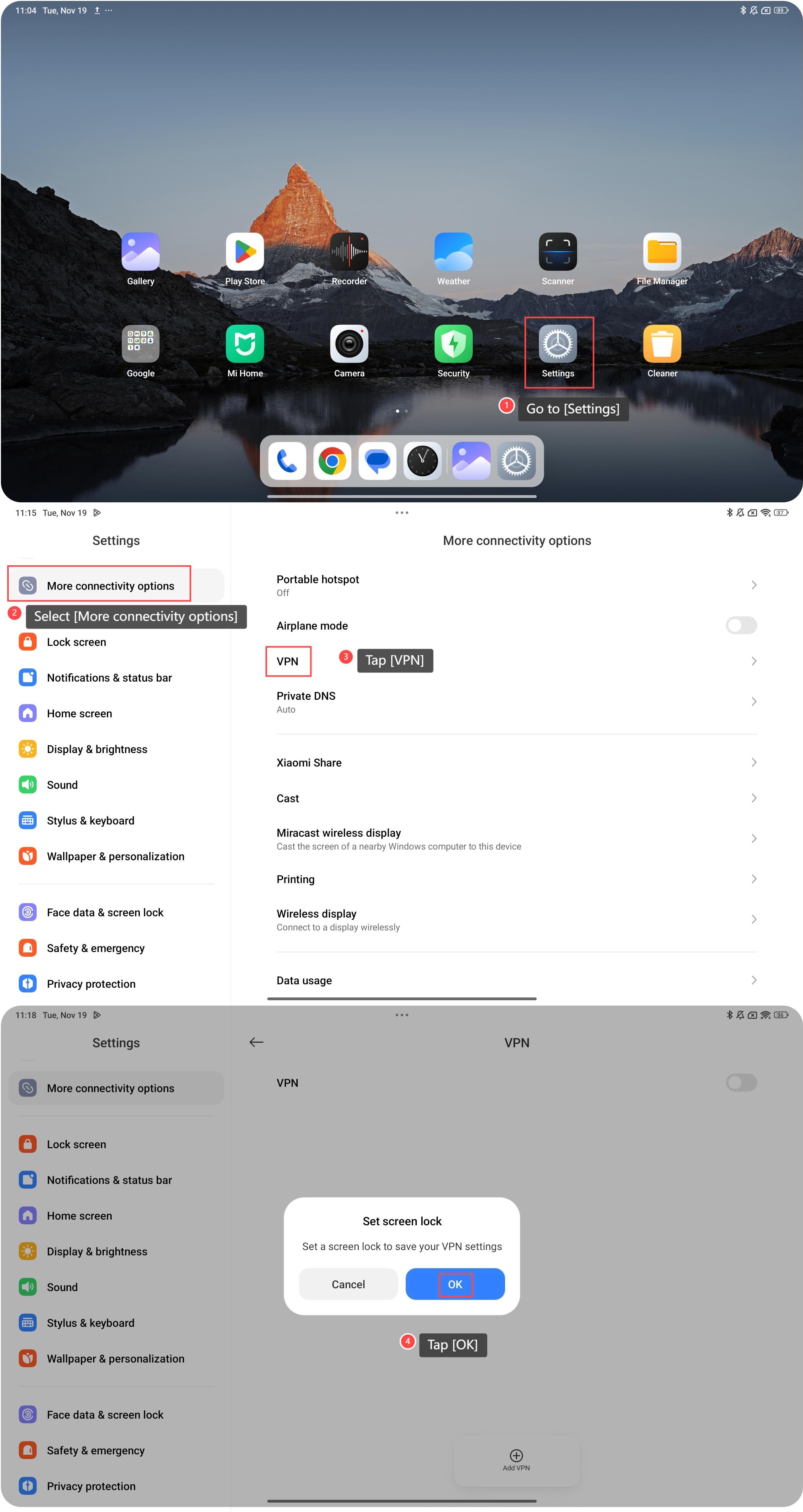 Để thiết lập VPN, vui lòng tham khảo các bước sau: