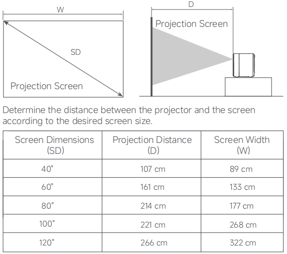 2. Khoảng cách chiếu (D): Khoảng cách giữa đầu trước của máy chiếu và màn hình (tính bằng cm);