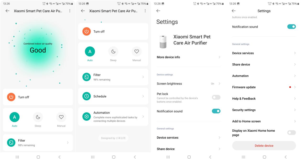 Sau khi kết nối Máy lọc không khí Xiaomi Smart Pet Care với ứng dụng Mi Home / Xiaomi Home, bạn có thể điều khiển các chức năng khác nhau trực tiếp từ giao diện chính. Cho người yêu cũample, bạn có thể bật hoặc tắt máy lọc, chuyển đổi giữa các chế độ khác nhau (Tự động, Ngủ hoặc Thủ công) và kiểm tra tuổi thọ còn lại của bộ lọc. Ngoài ra, bạn có thể đặt lịch trình hoặc tạo quy trình tự động hóa để tích hợp máy lọc với các thiết bị thông minh khác để hoạt động nâng cao hơn.