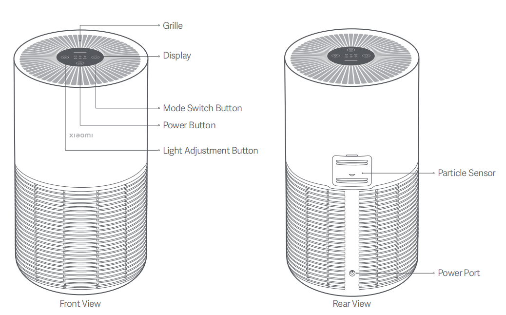 Sơ đồ này cho thấy mặt trước và phía sau views của Máy lọc không khí Chăm sóc thú cưng thông minh Xiaomi, làm nổi bật các thành phần chính của nó. Ở mặt trước, lưới tản nhiệt ở phía trên cho phép không khí lưu thông, trong khi màn hình cung cấp thông tin chính như chất lượng không khí và trạng thái hoạt động. Bên dưới màn hình, nút chuyển đổi chế độ cho phép bạn thay đổi giữa các chế độ, nút nguồn bật hoặc tắt máy lọc không khí và nút điều chỉnh ánh sáng cho phép bạn tùy chỉnh độ sáng. Ở phía sau, cảm biến hạt được sử dụng để theo dõi nồng độ các hạt trong không khí xung quanh và cổng nguồn, nằm ở phía dưới, kết nối thiết bị với nguồn điện.