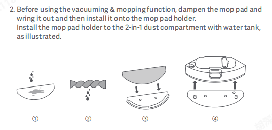 17.Q: Làm cách nào để sạc Xiaomi Robot Vacuum E10C?A: Nhấn và giữ nút bật / tắt, đợi đèn báo nguồn sáng rồi đặt thiết bị chính vào đế sạc để sạc.Lời khuyên: Khi nguồn điện yếu, thiết bị có thể không bật được, vui lòng đặt thiết bị chính trực tiếp vào đế sạc.18.Q: Làm cách nào để cài đặt Pad trên Xiaomi Robot Vacuum E10C?A: Làm theo hình minh họa, trước khi sử dụng các chức năng hút bụi và lau, hãy làm ướt và vắt miếng đệm, sau đó lắp nó vào Giá đỡ đệm, sau đó lắp nó vào Giá đỡ miếng đệm và lắp Giá đỡ miếng đệm trên bộ phận C bụi 2 trong 1 với Bình chứa nước.