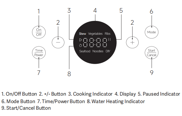 4. Nút Bắt đầu / Hủy: Nhấn để bắt đầu hoặc tạm dừng sản phẩm. Nhấn và giữ để hủy chức năng hiện tại;