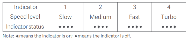 (1) Nhấn [Mode / Tốc độ B utton] để điều chỉnh tốc độ và đèn báo tốc độ tương ứng sẽ sáng (xem bảng bên dưới). Sau khi tắt quạt và bật lại, tốc độ sẽ là tốc độ được sử dụng cuối cùng;