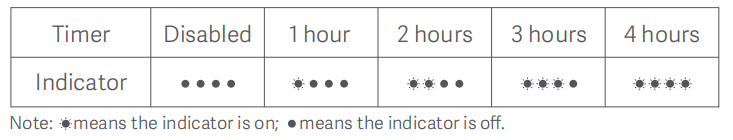 Nhấn [Hẹn giờ bật] để chuyển qua các bánh răng chờ hẹn giờ: 1 giờ, 2 giờ, 3 giờ, 4 giờ và tắt. Các chỉ báo tương ứng sẽ vẫn sáng trong năm giây (tham khảo bảng bên dưới), sau đó chỉ báo quay trở lại để cho biết tốc độ hiện tại.