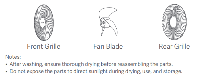 A: Khi lau thân và cánh quạt bằng khăn sạch, mềm, damp vải, bạn có thể tháo các vít trên lưới tản nhiệt phía sau để lấy cánh quạt ra và rửa trực tiếp bằng nước hoặc lau bằng khăn sạch, mềm, damp vải.