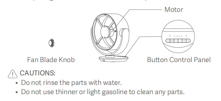 7. Không rửa sạch Núm Fan Blade, Động cơ và Bảng điều khiển nút bằngnước.