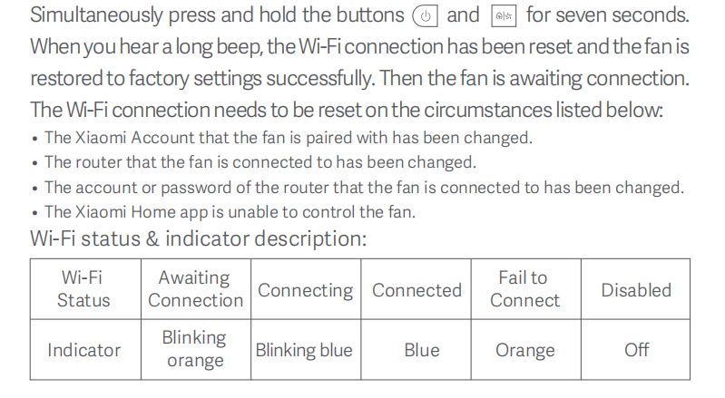 A: Khi kết nối lần đầu tiên hoặc không thể kết nối với ứng dụng Mi Home / Xiaomi Home, hãy nhấn và giữ đồng thời [Standby Button] và [Mode / Speed Button] trong bảy giây. Khi bạn nghe thấy tiếng bíp dài, kết nối Wi-Fi đã được đặt lại thành công. Sau đó, quạt đang chờ kết nối.