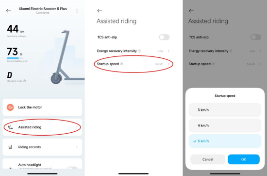 Vui lòng truy cập ứng dụng Mi Home / Xiaomi Home >> [Xiaomi Electric Scooter 5 Plus] >> [Hỗ trợ lái xe] >> [Tốc độ khởi động] >> chọn [3km / h], [4km / h] hoặc [5km / h].