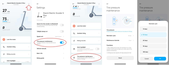 A: Xiaomi Electric Scooter 5 Plus không hỗ trợ kiểm tra áp suất lốp trong APP, nhưng bạn có thể đặt lời nhắc bảo dưỡng áp suất lốp trong APP.