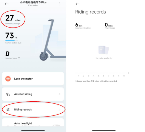 A: Bạn có thể kiểm tra Số dặm còn lại, Hồ sơ đi xe và Tổng số dặm trên ứng dụng Mi Home / Xiaomi Home.
