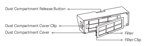 6. Trên ngăn chứa bụi là nút tháo ngăn chứa bụi, kẹp nắp ngăn chứa bụi, nắp ngăn chứa bụi, bộ lọc và kẹp lọc;