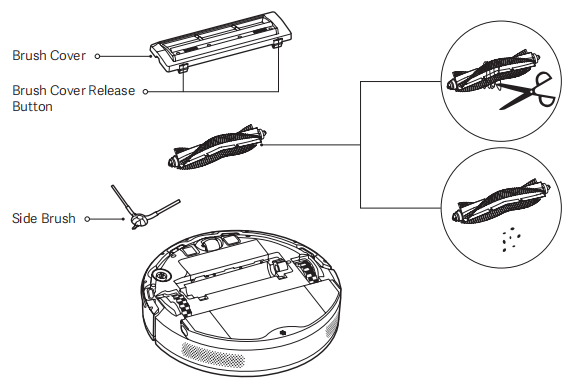 2. Ở mặt dưới là bàn chải bên, cảm biến vách đá, bánh xe, tiếp điểm sạc, bánh xe, nút nhả nắp bàn chải, nắp bàn chải và bàn chải;