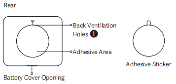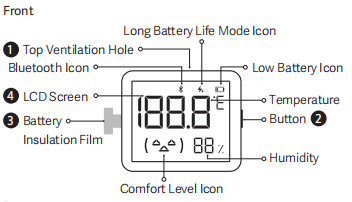Có Biểu tượng chế độ tuổi thọ pin dài, Biểu tượng pin yếu, Nhiệt độ, Nút, Độ ẩm, Biểu tượng mức độ thoải mái, Lỗ thông gió trên cùng, Biểu tượng Bluetooth, Màn hình LCD và Màng cách nhiệt pin ở phía trước. Có Lỗ thông gió phía sau, Khu vực kết dính và Mở nắp pin ở phía sau. Ngoài ra còn có một nhãn dán dính riêng biệt.