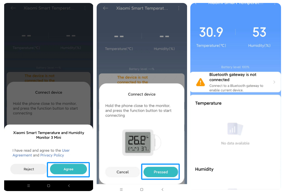 1. Liên kết Xiaomi Smart Temperature and Humidity Monitor 3 Mini, máy tạo ẩm và cổng Bluetooth trong một Tài khoản Xiaomi và khoảng cách giữa cổng Bluetooth và Xiaomi Smart Temperature and Humidity Monitor 3 Mini không được vượt quá 5m;