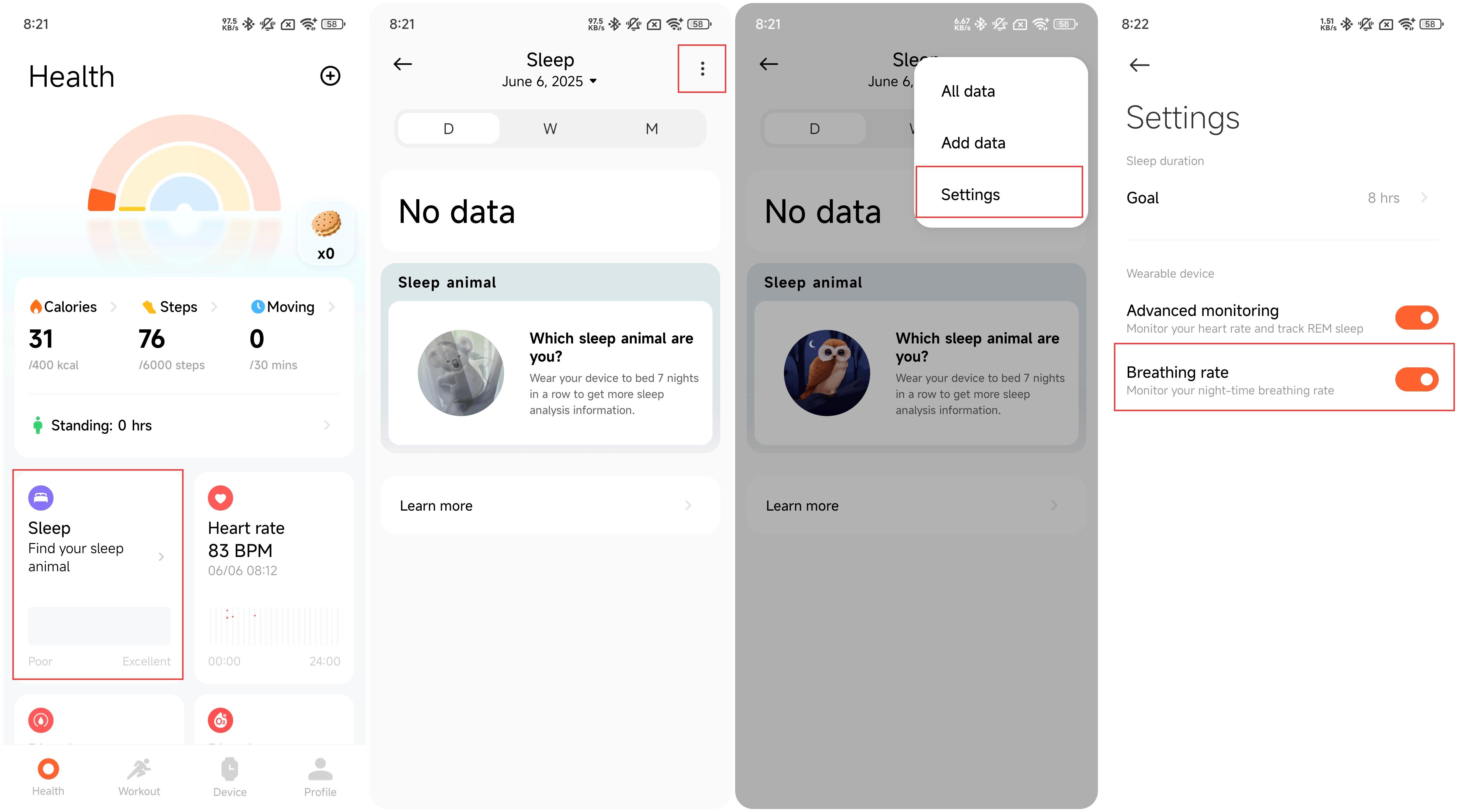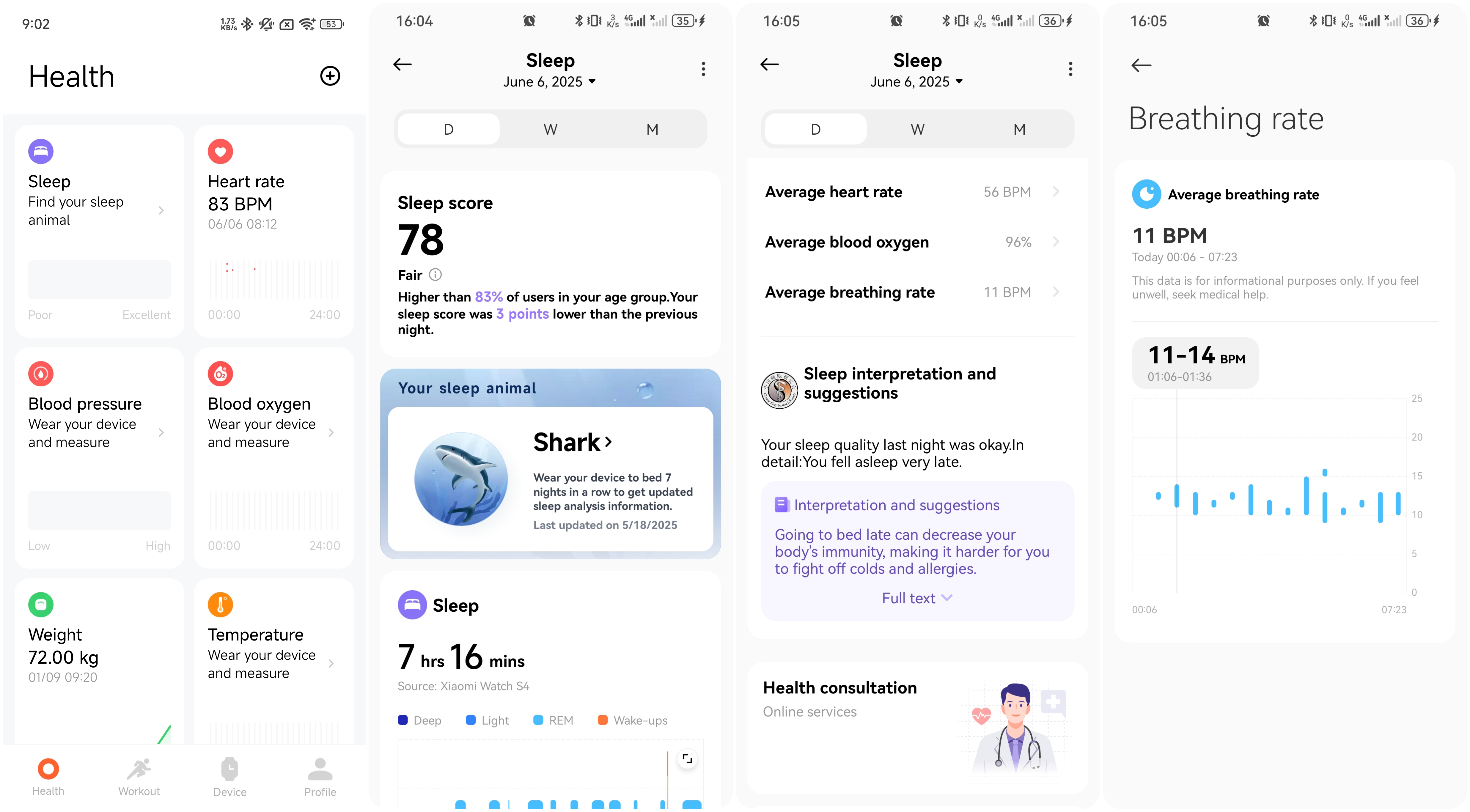 3. Nhịp thở trong khi ngủ: Khi dây đeo phát hiện bạn đang ngủ, nó sẽ tự động theo dõi nhịp thở trung bình của bạn. Bạn có thể view dữ liệu trong ứng dụng Mi Fitness >> [Sức khỏe] >> [Ngủ] >> [D]>> [Nhịp thở trung bình] hoặc view nó bằng cách chuyển đến danh sách APP của ban nhạc >> [Ngủ] >> [Cài đặt] >> [Nhịp thở];