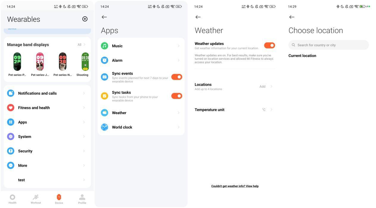 1. Điện thoại Android: Vào ứng dụng Mi Fitness >> [Thiết bị] >> [Apps] >> [Thời tiết] và làm mới sau khi nhập hoặc nhấn vào thành phố để định vị lại;