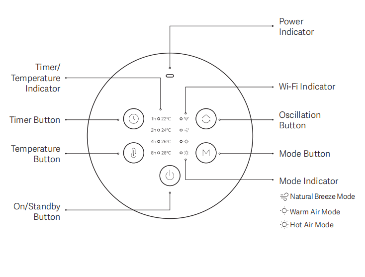 Chức năng của các nút trên Máy sưởi Graphene thông minh Xiaomi như sau: