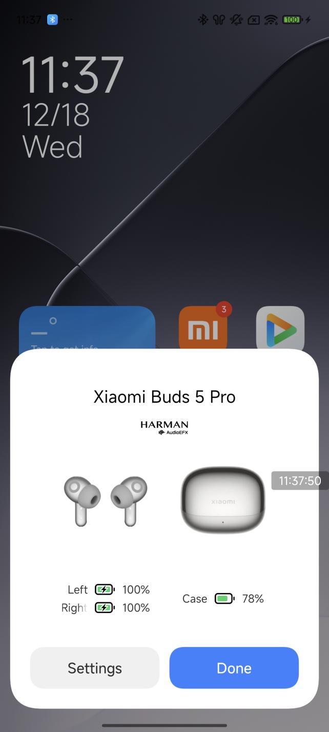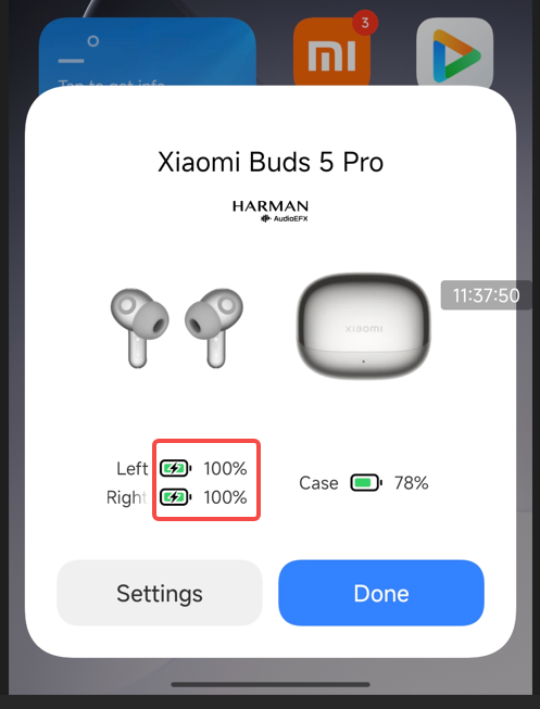 A: Cửa sổ bật lên Xiaomi của Xiaomi Buds 5 Pro hiển thị mức pin hiện tại của tai nghe và hộp sạc, trạng thái sạc và kết nối nhanh.