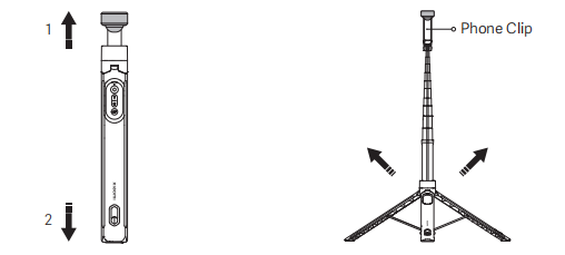 1. Kéo kẹp điện thoại ra: Kéo kẹp điện thoại cùng với thanh ống lồng ra từ trên cùng của chân máy gậy tự sướng;