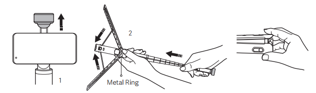 2. Nắm lấy phần tiếp giáp với vòng kim loại và đẩy phần trên của kẹp điện thoại để rút chân máy, sau đó bóp chân máy cho đến khi bạn nghe thấy âm thanh "tách" để đảm bảo rằng chân máy và thanh ống lồng được rút lại hoàn toàn.