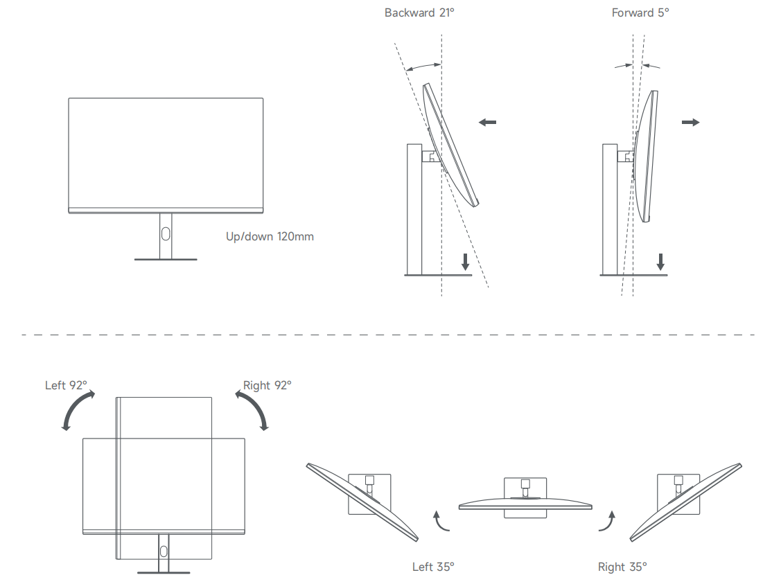 Để điều chỉnh độ cao hoặc chuyển sang chế độ dọc, chỉ cần đẩy màn hình lên hoặc xuống trực tiếp. Khi chuyển sang chế độ dọc, vui lòng nâng màn hình lên vị trí cao nhất trước khi xoay để tránh va vào bàn.