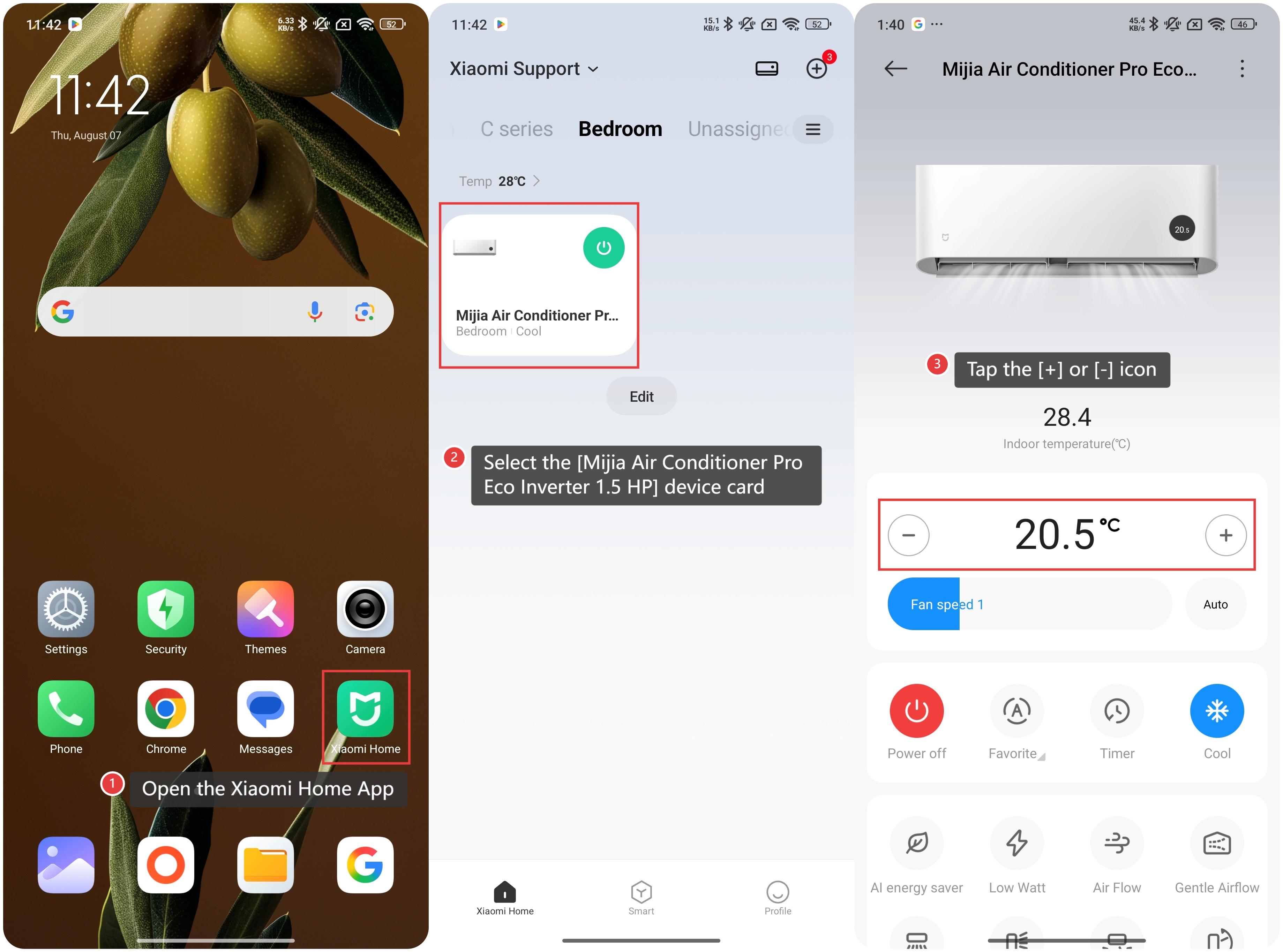 Để điều chỉnh nhiệt độ của Mijia Air Conditioner Pro Eco Inverter 1.5 HP thông qua Ứng dụng Xiaomi Home, vui lòng tham khảo các thông tin sau: